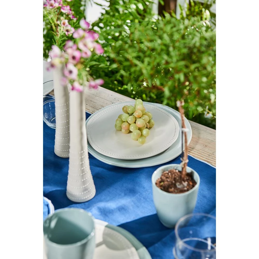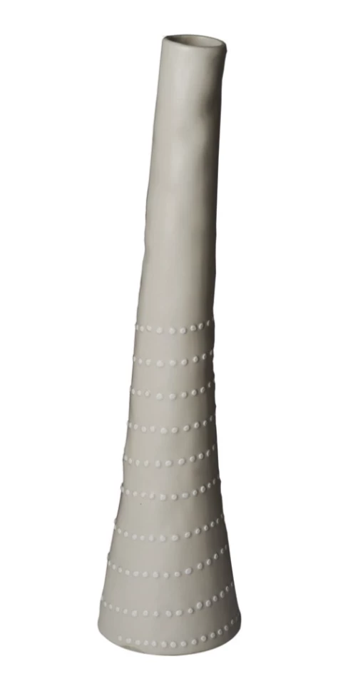 This charming bud vase adds a perfect touch to any table setting. It is handmade stoneware with dots detailed around the bottom half.