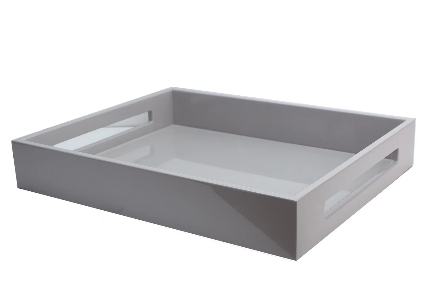 THE GORGEOUS CHIFFON GREY MEDIUM TRAY FEATURES 20 COATS OF HIGH GLOSS LACQUER, HAND-POLISHED BETWEEN EACH COAT.