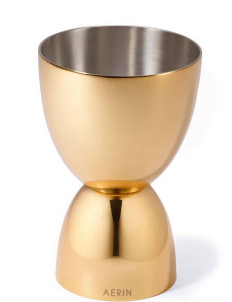 A jigger and shaker are home bar essentials! The gold-plated Fausto set has a rounded look that adds a luxurious touch to a tabletop, bar or tray. The double-sided jigger includes an exterior line that marks 1 ounce on one side and a ½ ounce on the other.