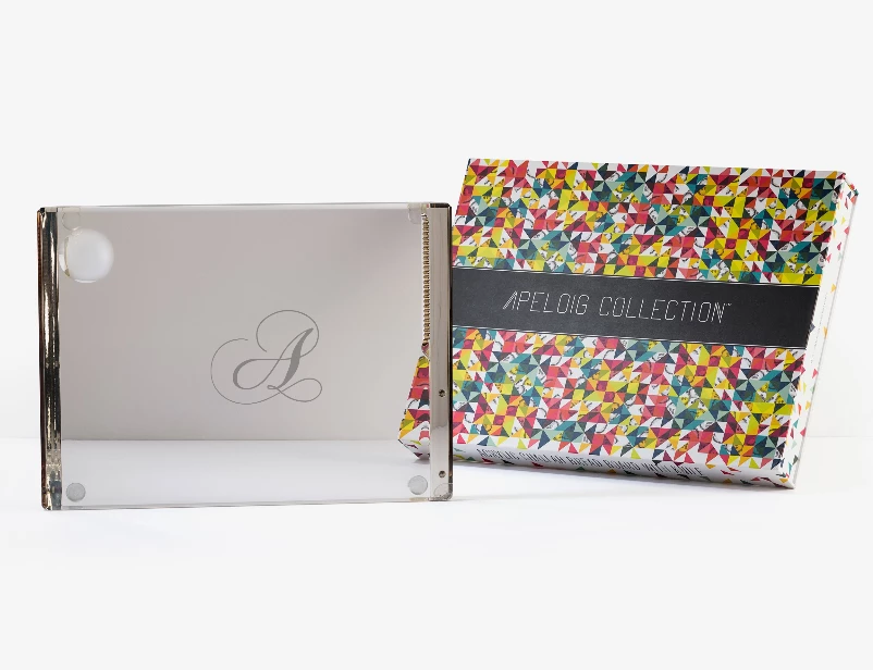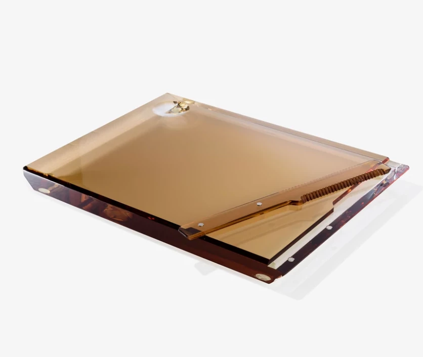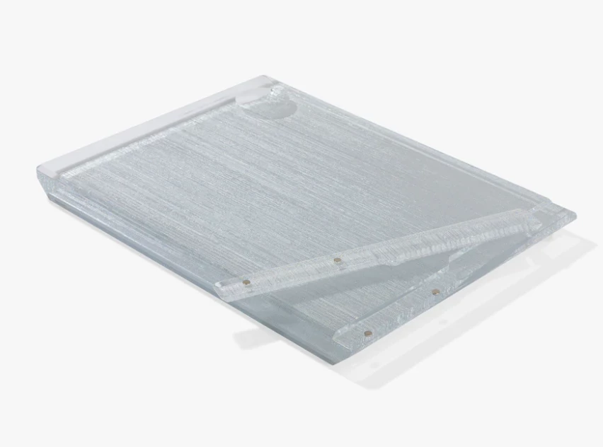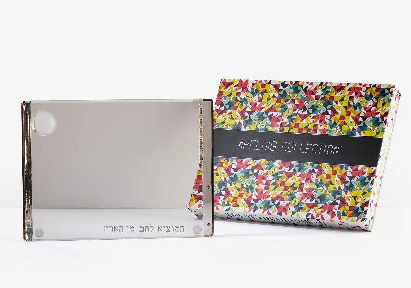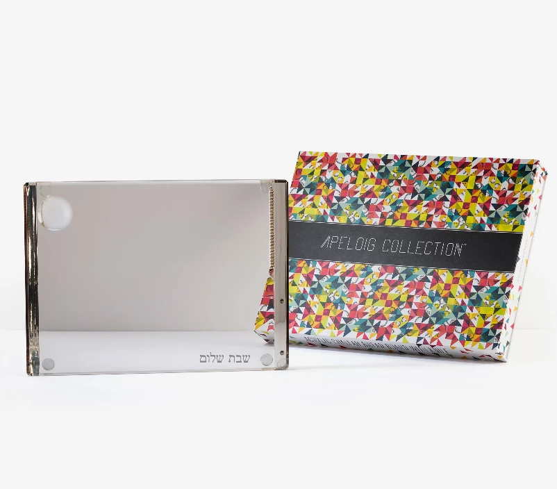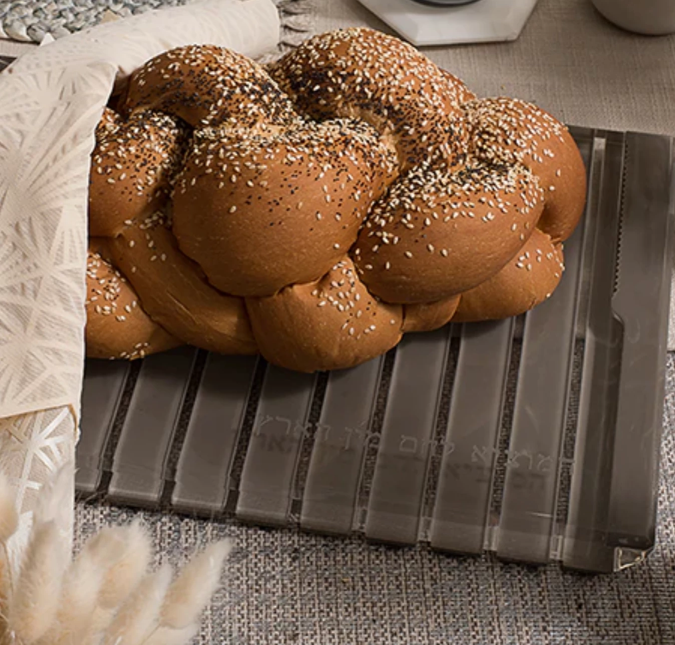 Made of beautiful translucent acrylic, this modern challah board is as dazzling as it is versatile. Meticulously designed features include a magnetically attached knife that will never harm the acrylic surface, it fits in its own nook and it is flush with the board, a built-in dish for salt or honey and ergonomic borders that make the board easy to grip.