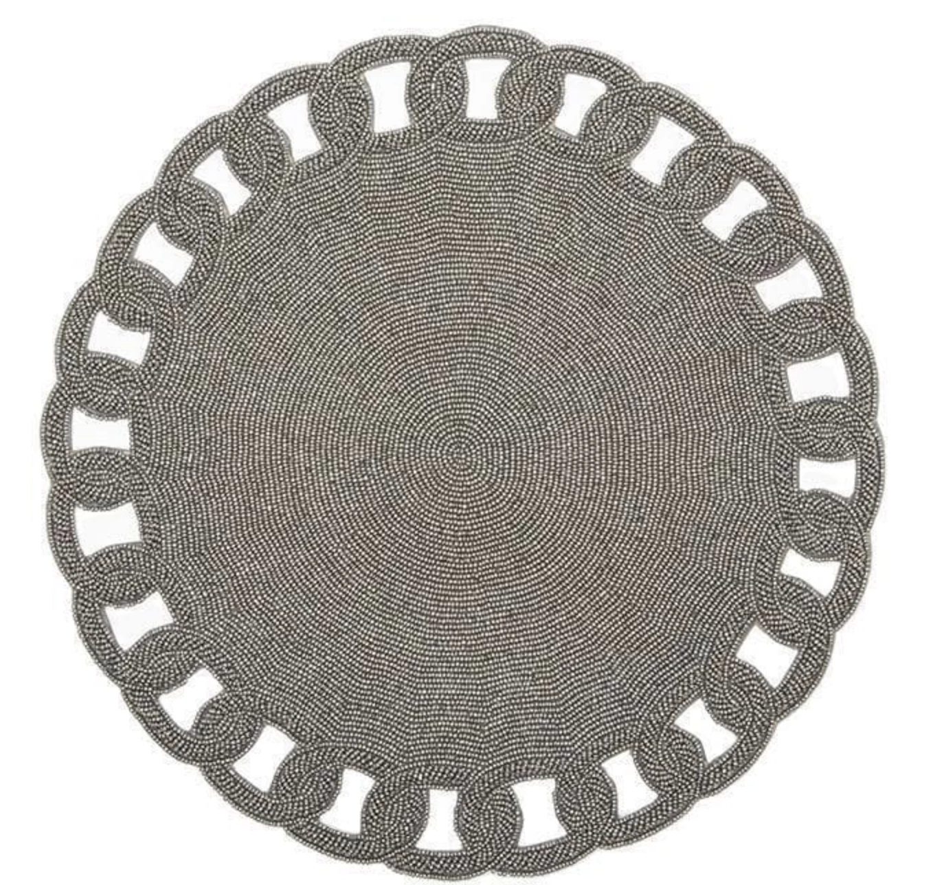 This metallic beaded placemat has a chain link edge that has a modern flair and sophisticated presentation. It can be super dressy for special occasions or offers just the right amount of glam for a small dinner party.