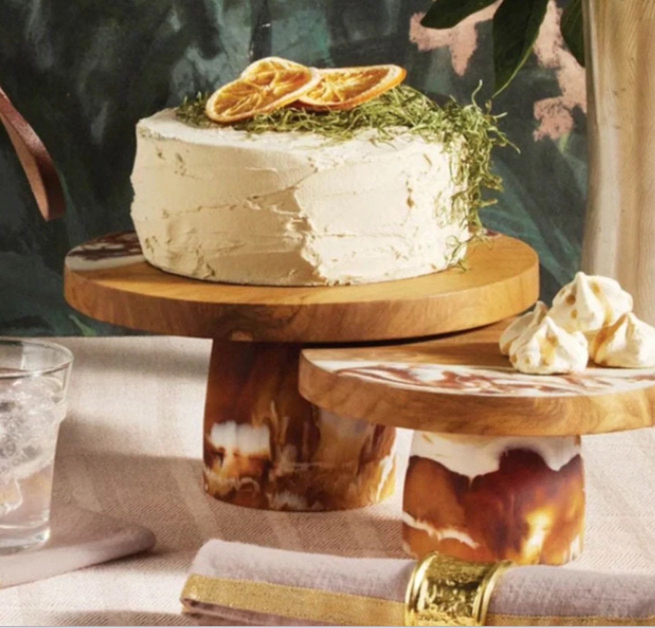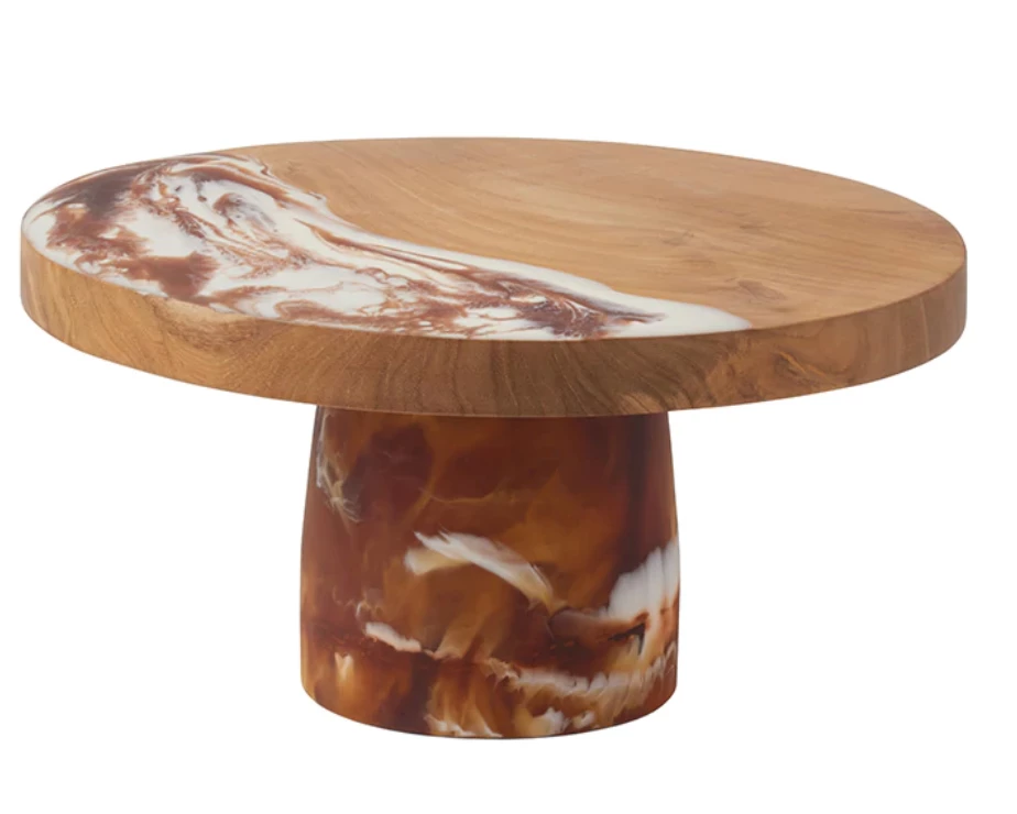 Teak and resin are handcrafted together, bringing a splash of color to this two-tone cake stand. Hand-dipped, each piece is one-of-a kind.