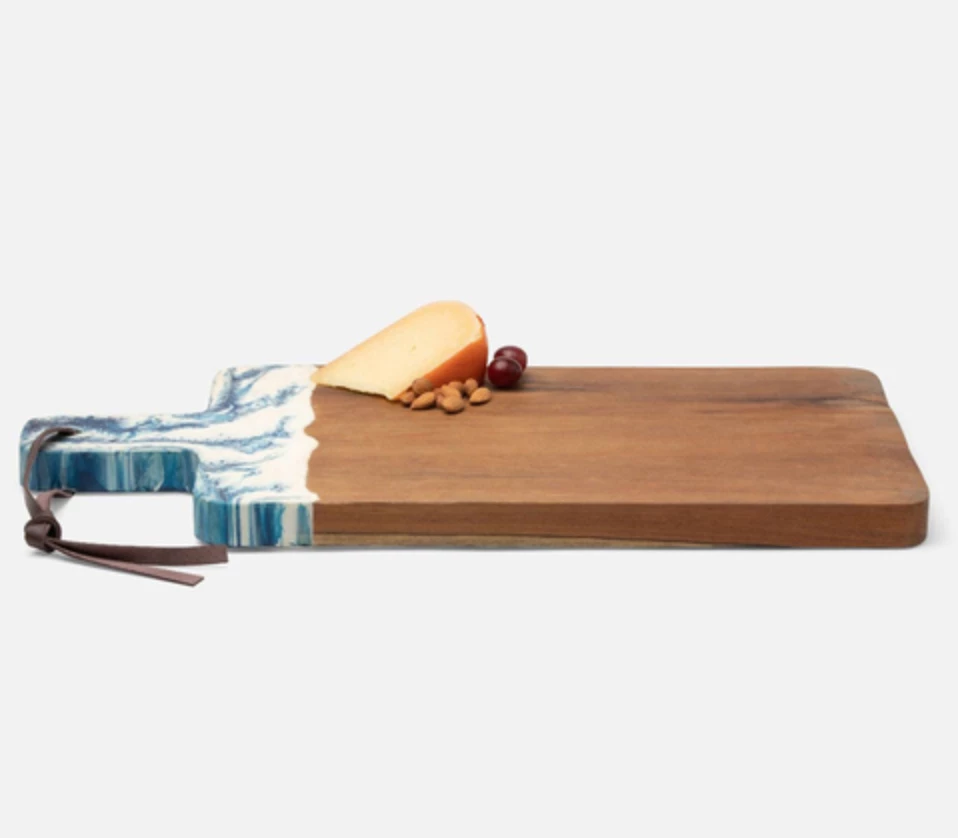 Teak and resin, two materials handcrafted together, bring a splash of color to any setting. A unique two-tone, hand-dipped piece, no two boards are exactly alike. Finished with a leather strap.