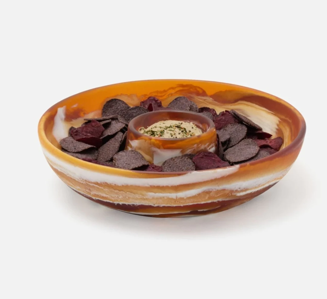 This high-contrast swirled resin bowl is the epitome of super-hip—made for chips and dip, or to display fresh fruit, centerpiece arrangements, and more.