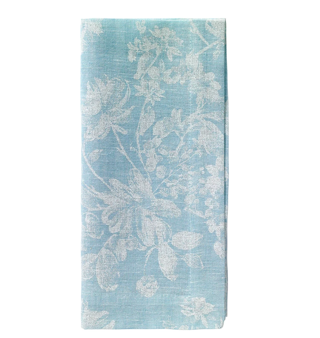 Floral prints are everywhere and this is a beautiful print on colored yarn-dyed linen. Make your table bloom with this set.