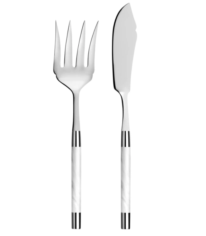 Made of the finest polished 18/10 stainless steel, this beautiful Fish Serving set has white acrylic handles that lend a modern touch to the table.