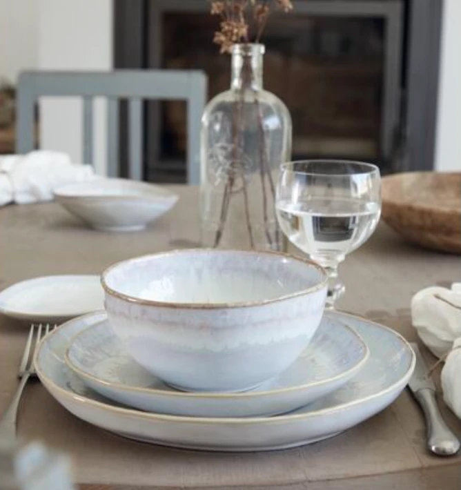 The Brisa Sal Dinnerware Collection blends white and cream and glazes and hand formed organic shapes to transport us to the beautiful landscape of the Algarve coast.