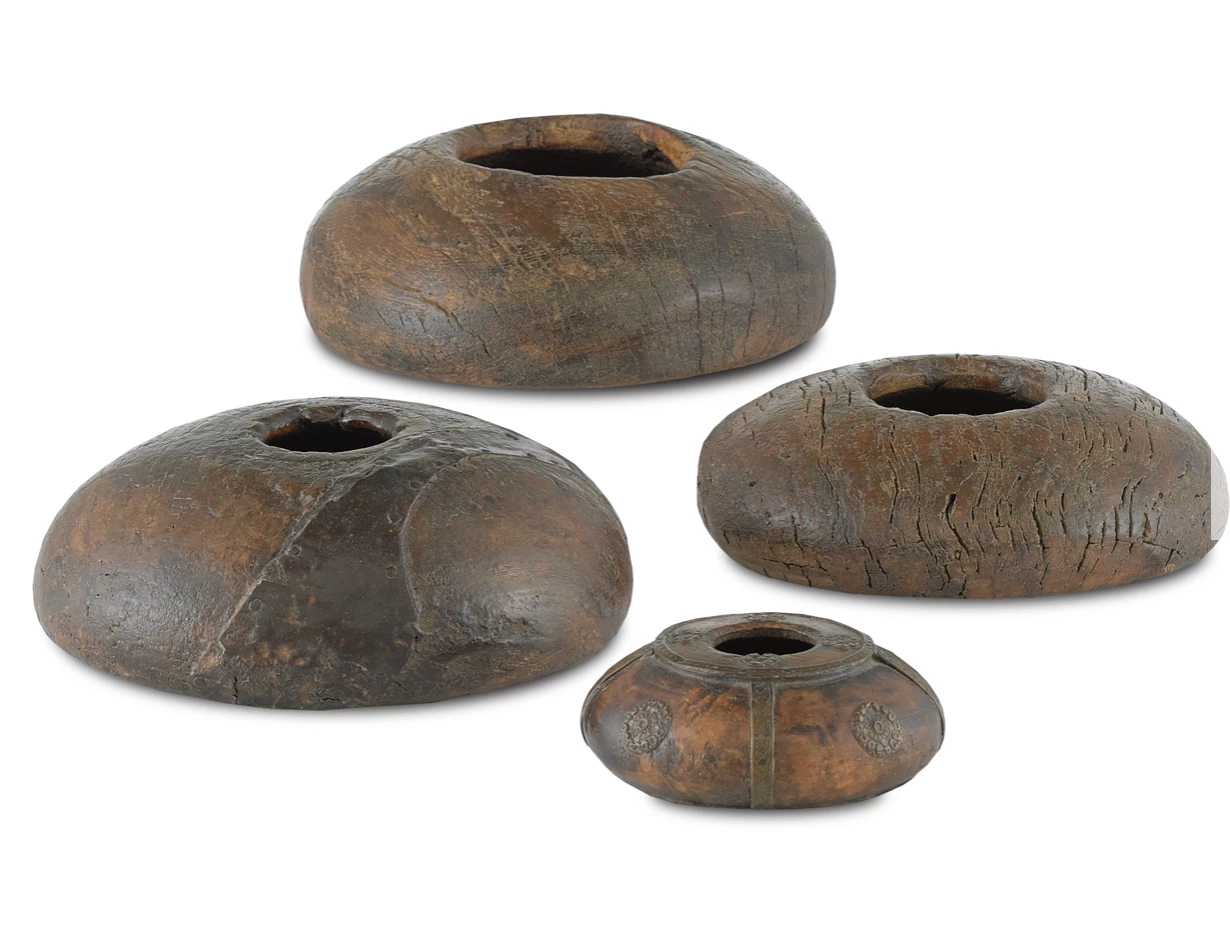 This Vessel collection includes four old tobacco boxes, in a rich dark color, carved from a single piece of wood. This flat shape indicates these vessels were reserved for high-end tobacco. No two assortments of these heavily distressed wood decorative vessels will be alike and them come together to create a unique piece in your home
