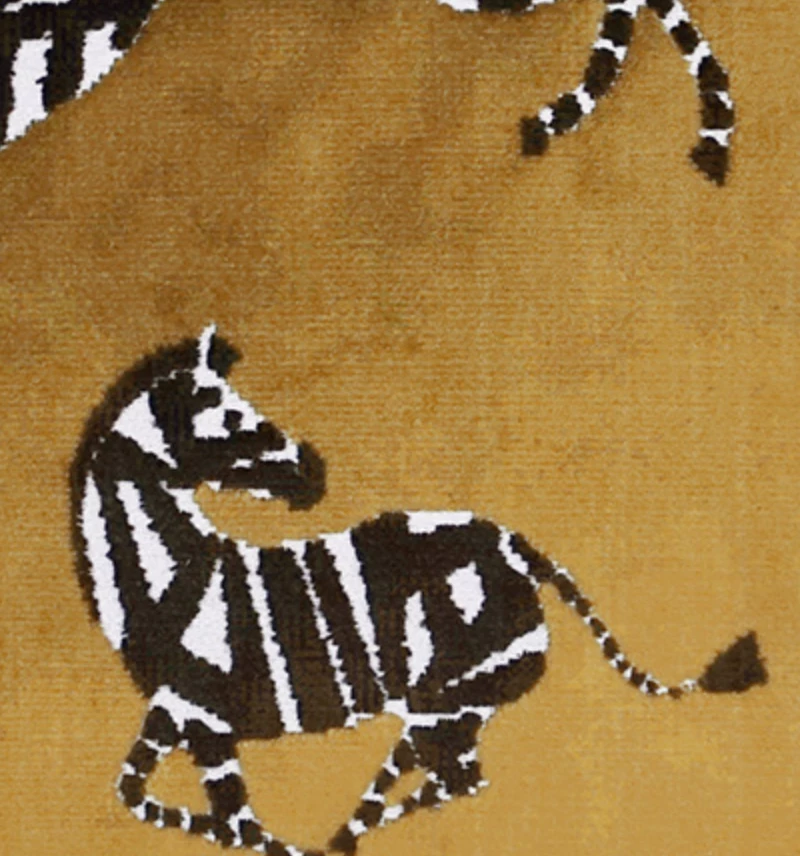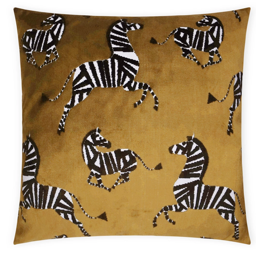 Animals are all the rage and the Farlow pillow has woven Zebras in black and white on a velvet Golden Topaz background.