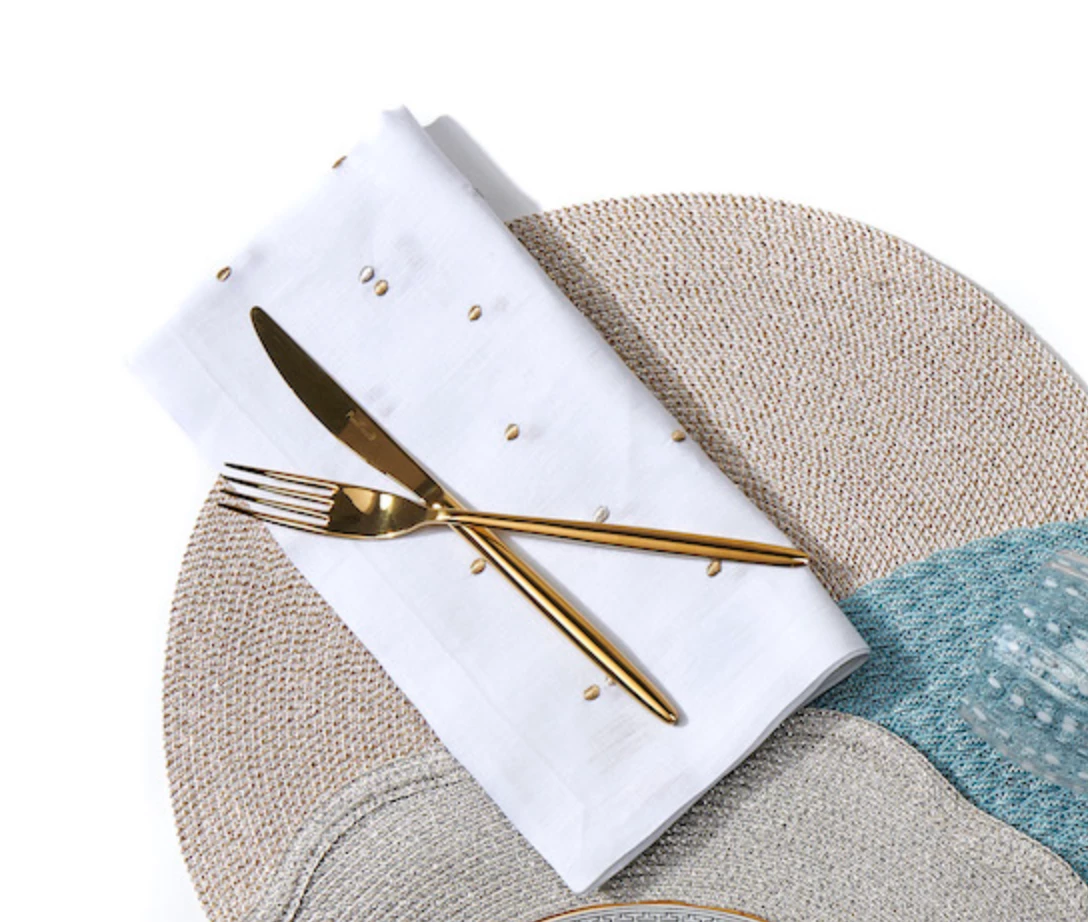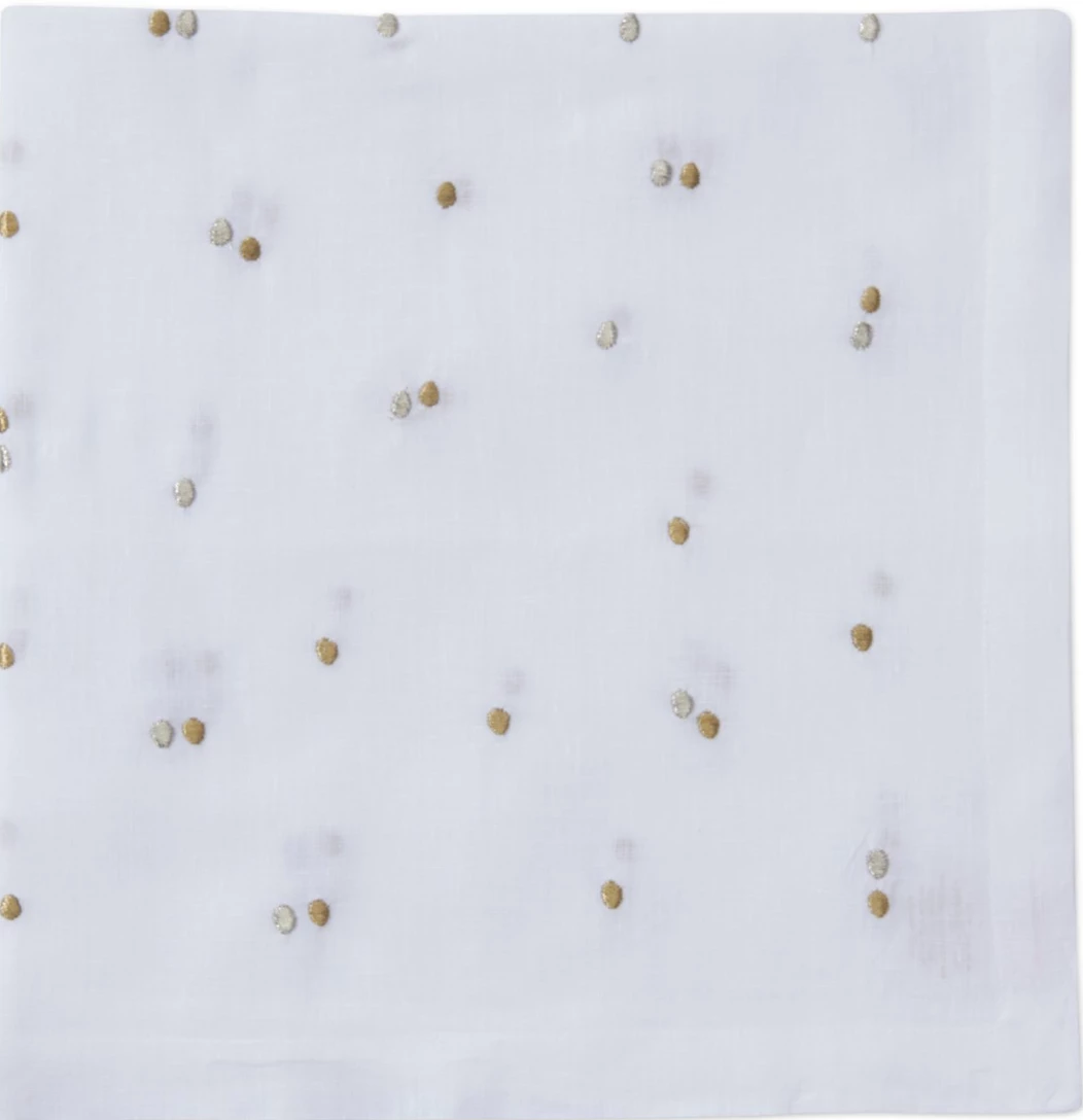 An elegant napkin made of Italian linen. The napkin was hand embroidered in Vietnam with Confetti like dots throughout the napkin.