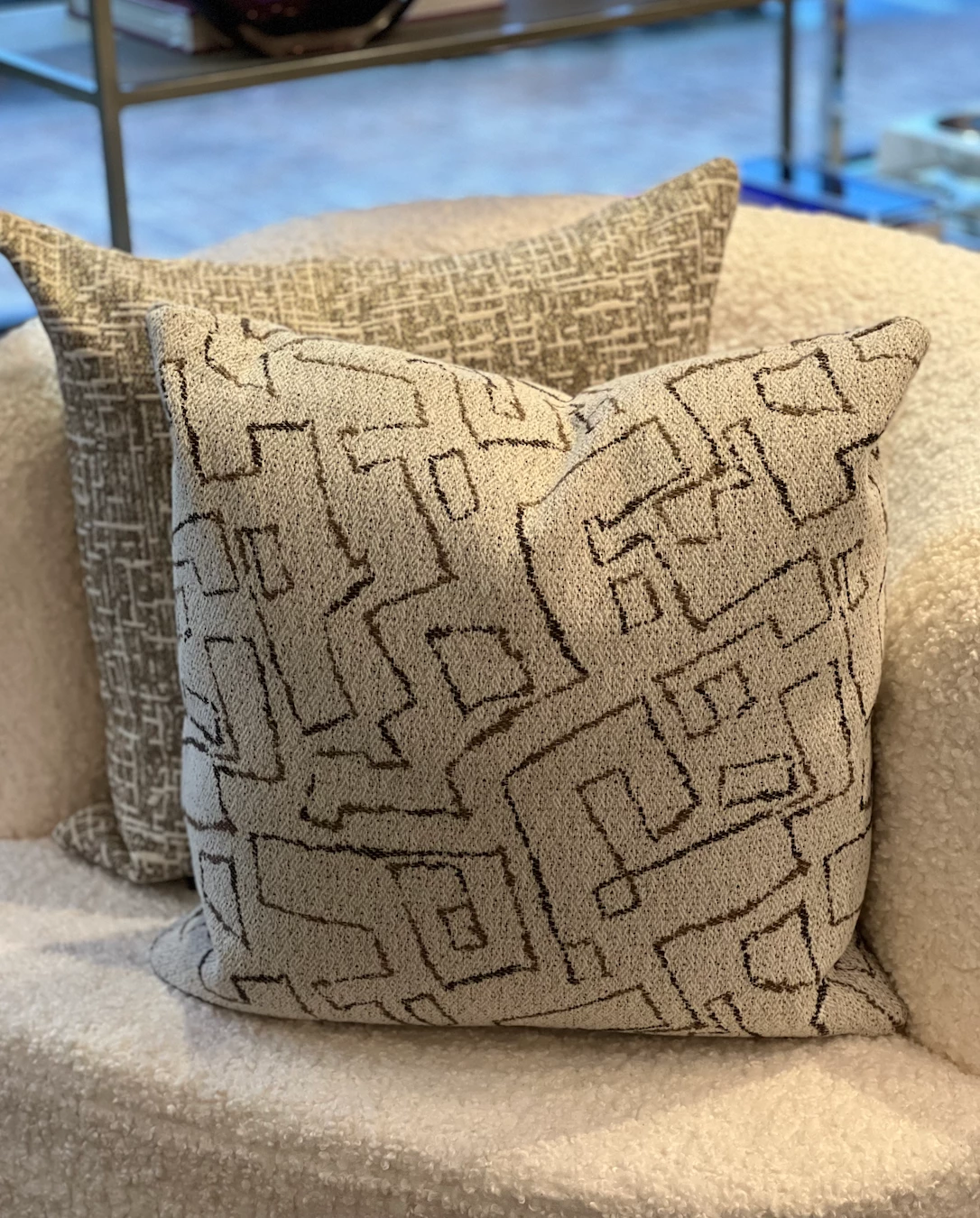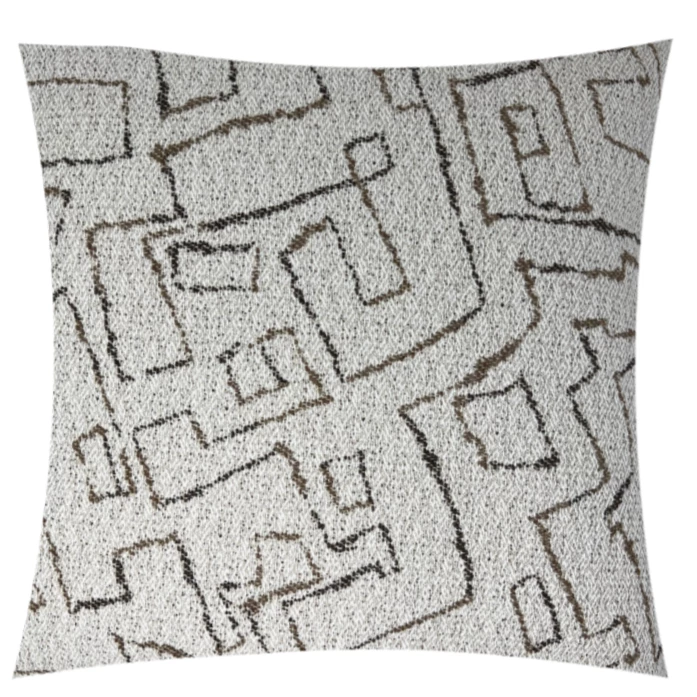 An of the moment textured abstract pillow. The design has shades of dark and lighter brown through an ivory pillow