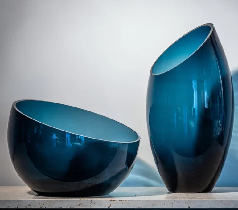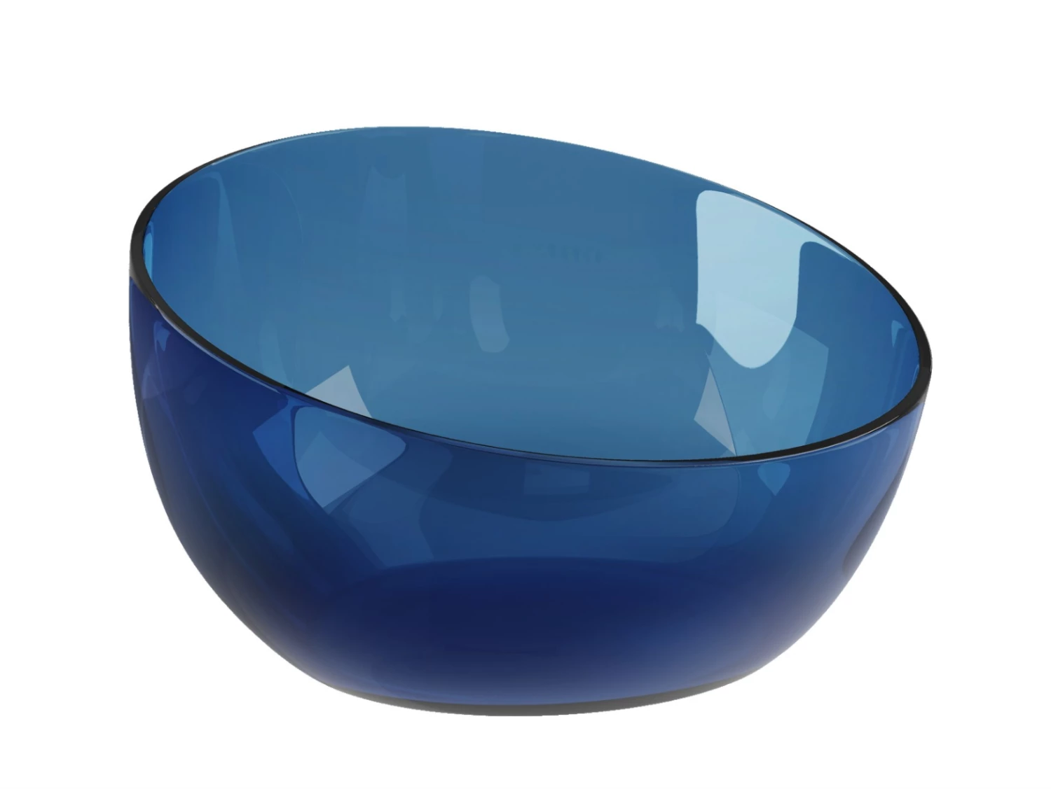 A large bowl made of blue glass that works beautifully as a centerpiece on a table.