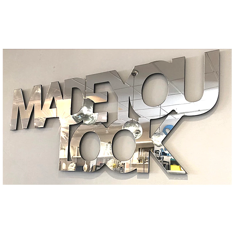 We MADE YOU LOOK, our” Say Anything” acrylic mirror art series offers statement making pieces to hang in your home. Hanging device on the back.