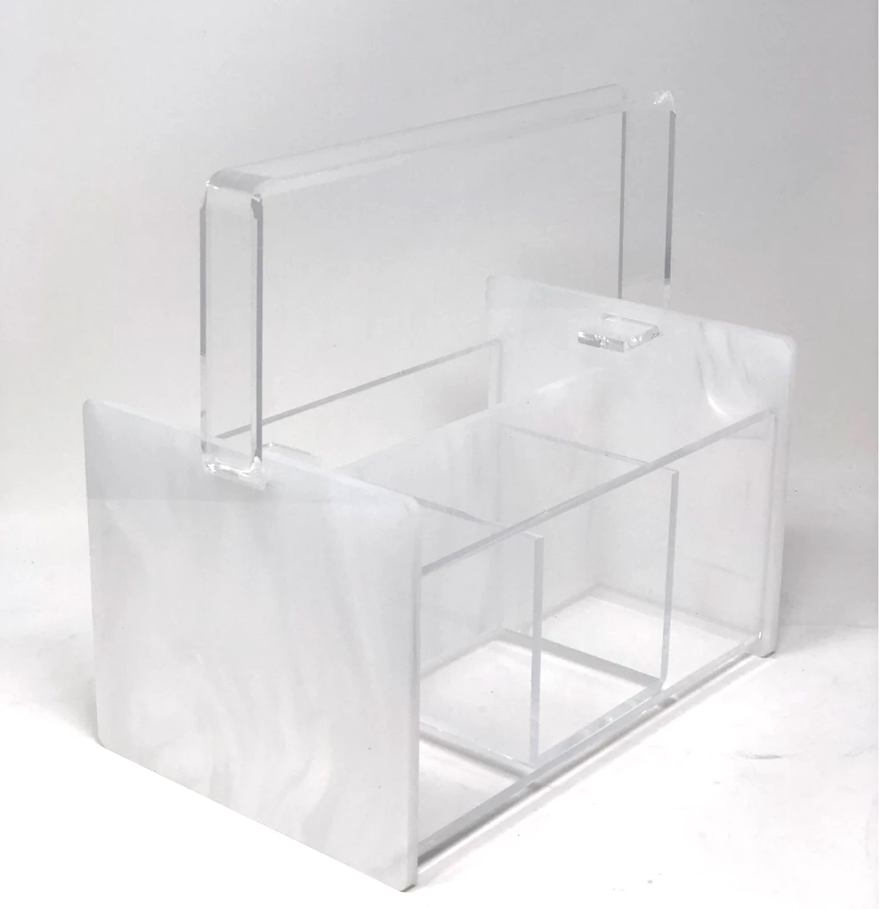 Our silverware caddy is a must have for serving indoors or outdoors. With multiple compartments for flatware and a spot for napkins the marble acrylic caddy goes with everything. The handle is removable for easy storage.