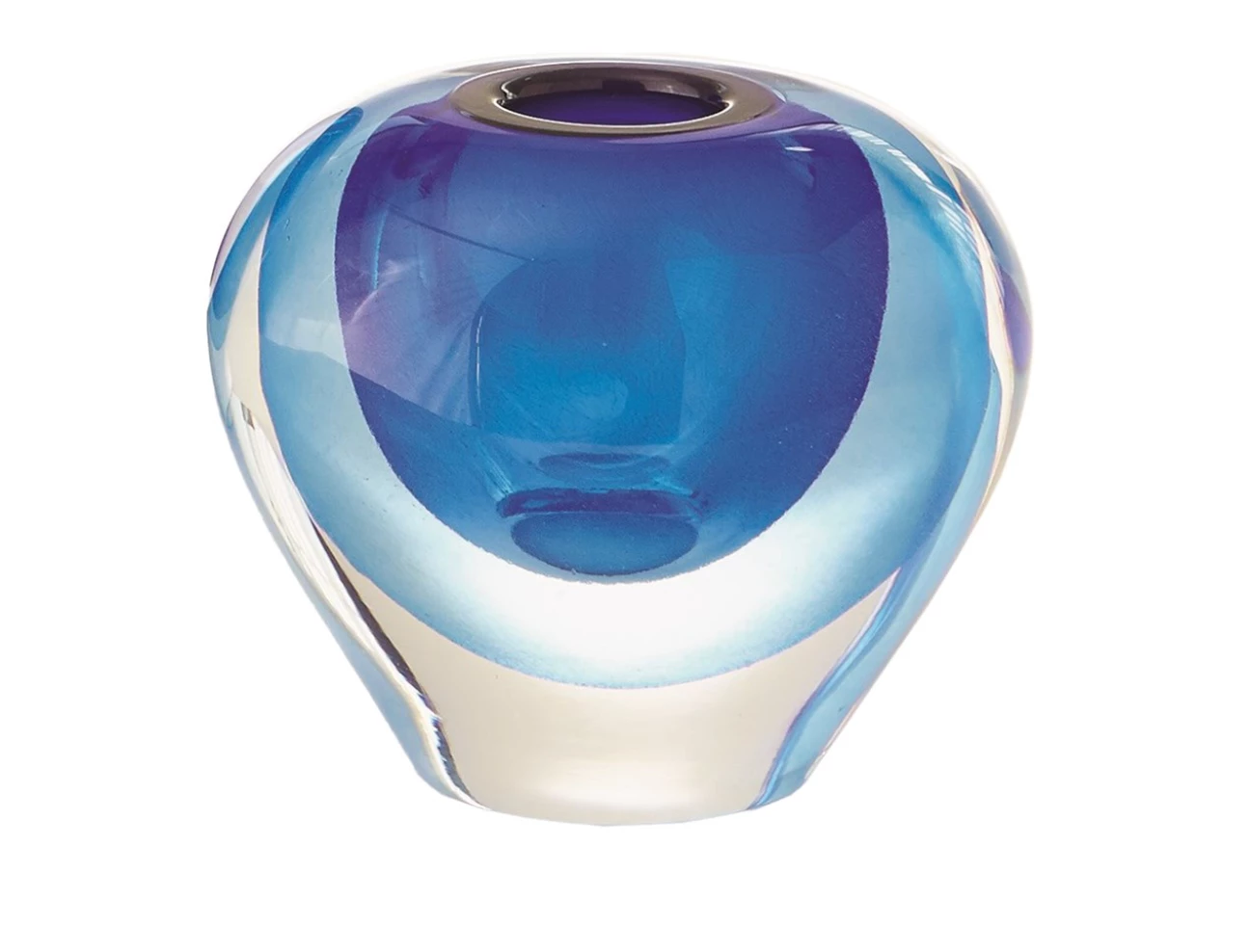 THE ORGANIC LAYER VASE IS MADE OF THICK GLASS IN BEAUTIFUL SHADES OF WATERY BLUE & DEEP SAPPHIRE ART GLASS.