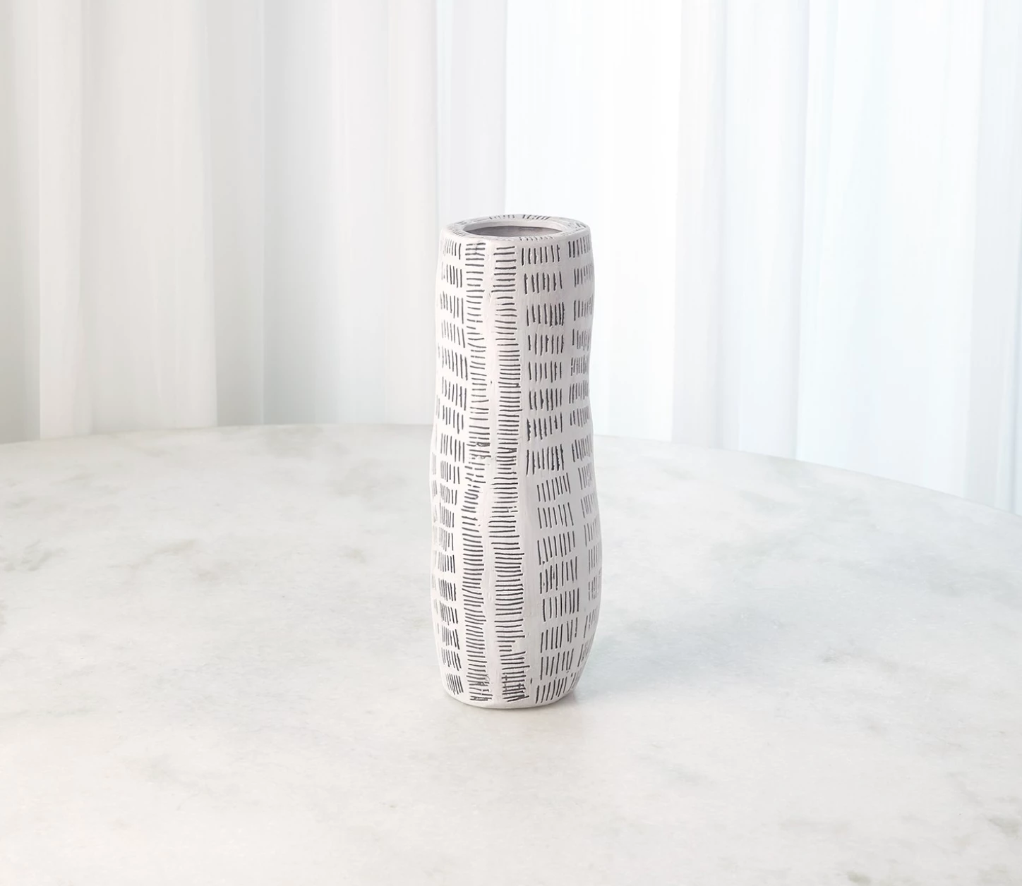THE QUENCY VASES HAVE AN AFRICAN INSPIRED DESIGN CARVED INTO THE CERAMIC, WHICH ARE GLAZED AND WASHED TO CREATE THE CONTRACT BETWEEN THE PATTERN AND THE BODY. HANDMADE IN ITALY.