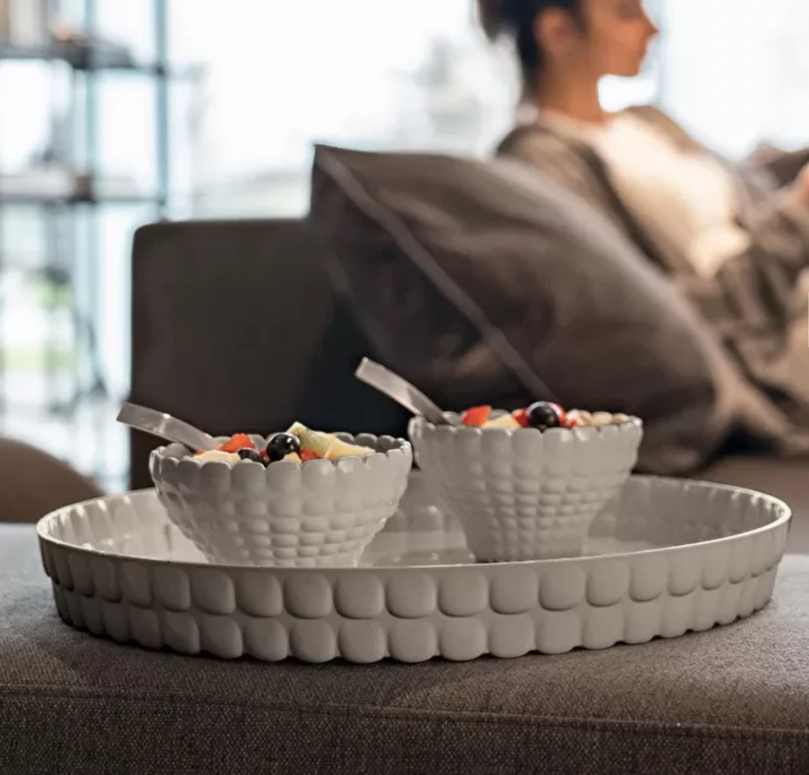 The Tiffany collection has a modern scallop edge and an be used for serving by mixing and matching the pieces. Easily goes from casual lunch to dinner or cocktails.