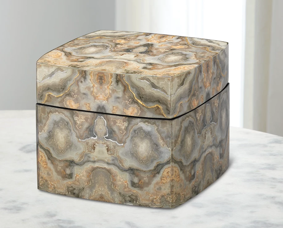 The Ink Blot box inspires you to look closer into the soothing neutral tones of grey, taupe and cream, accented with silver and gold leaf. These components create dynamic patterns through overlaid photos underneath a clear lacquer. Perfect for a cocktail table or accent on a console. Made of wood composite.