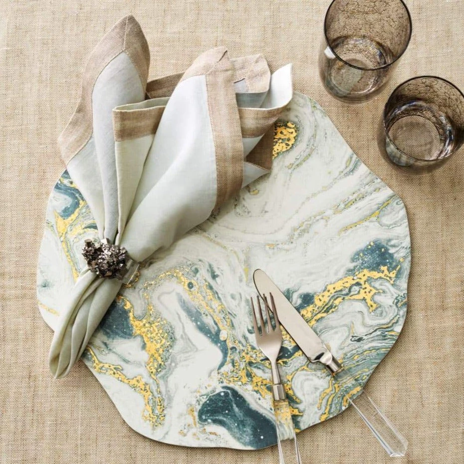 The linen Dip Dye Napkin features an ombre gradation in silver and gray tones, adding a subtle elegance to the refined linen napkin. This muted yet gorgeous color combination complements any festive table. These linen napkins are hand dipped and dyed and accented with a luxurious metallic foil border.