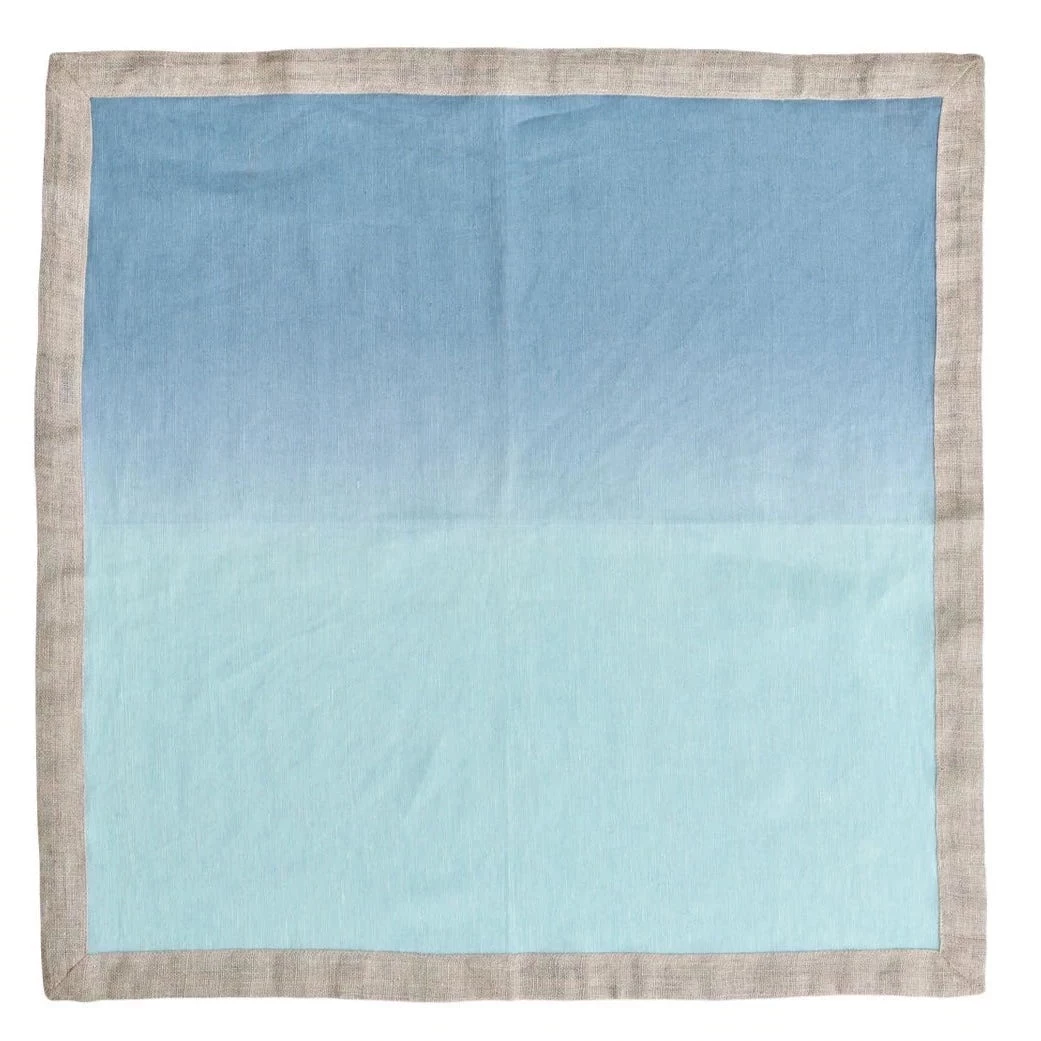 The Linen Dip Dye Napkin by Kim Seybert, features an ombre gradation from fuchsia to orange, adding a subtle elegance to the refined linen napkin. This gorgeous rich color combination complements any festive table. These linen napkins are hand-dipped and dyed and accented with a luxurious metallic foil border.