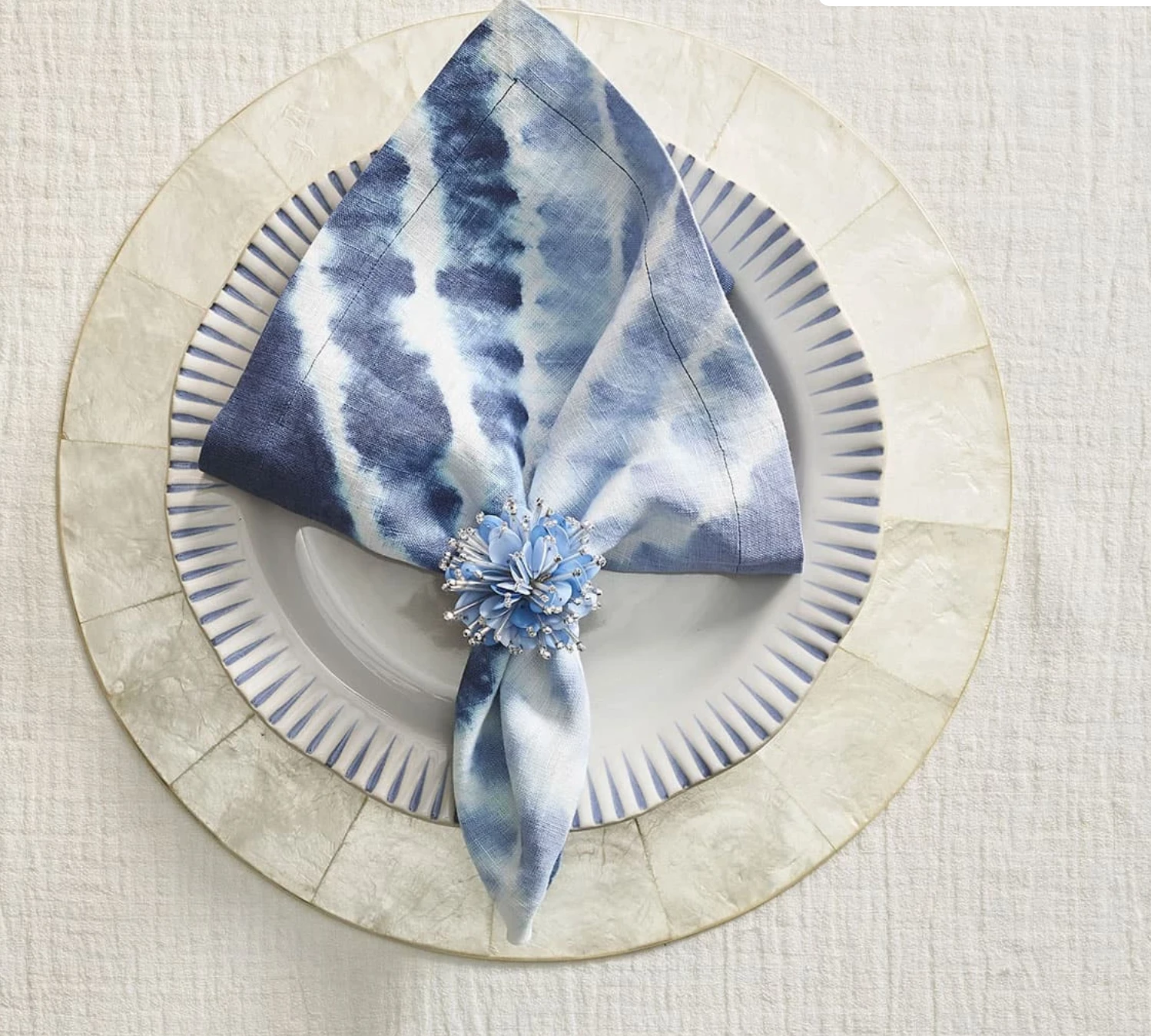 The linen Duo Dye Napkin by Kim Seybert, has contrasting natural hues created by diagonally folding and pleating the linen. The linen napkin is then dipped in two different colors, navy and periwinkle, to create the tilted wave-like pattern. The exception feel of this luxurious linen only increases with every wash.