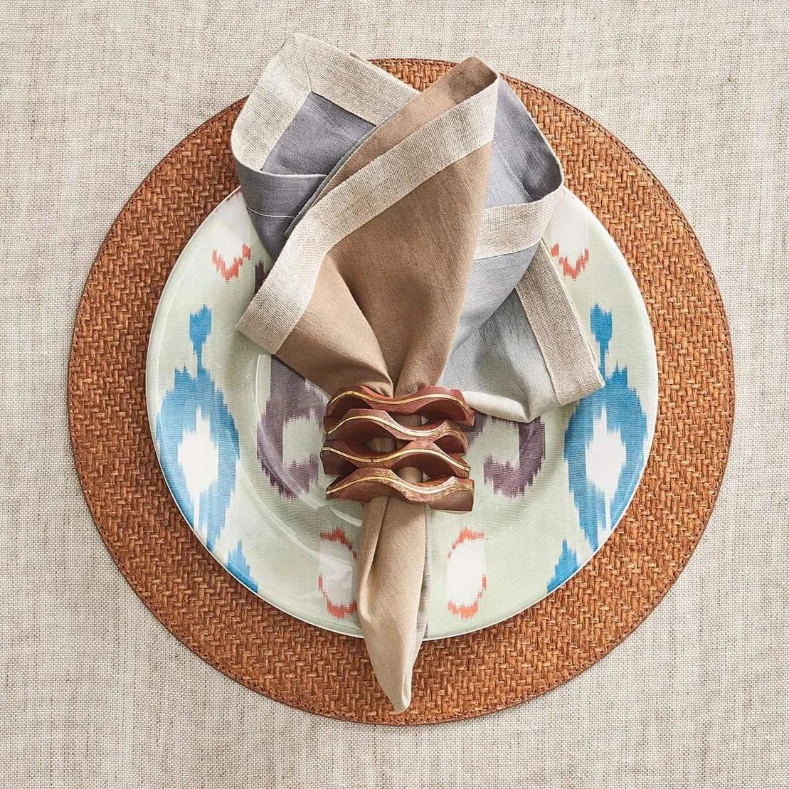 The round, woven Saigon Placemat features beautifully woven, brown raffia, a modern take on a neutral palette. The round, woven Saigon Placemat utilizes the classic Vietnamese plaiting technique, giving the woven placemat texture and depth.