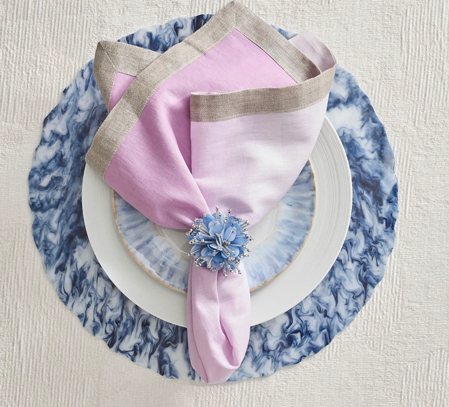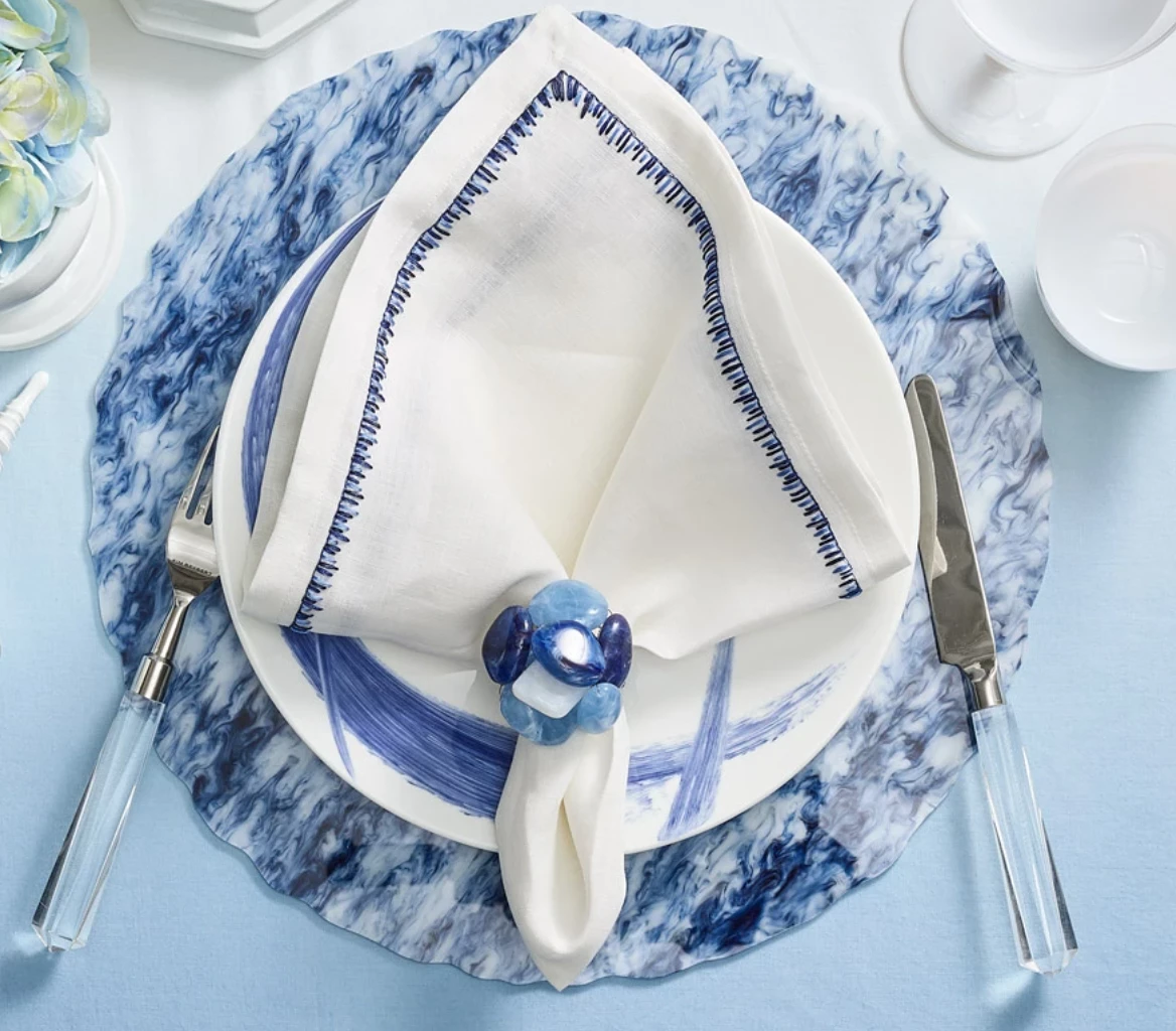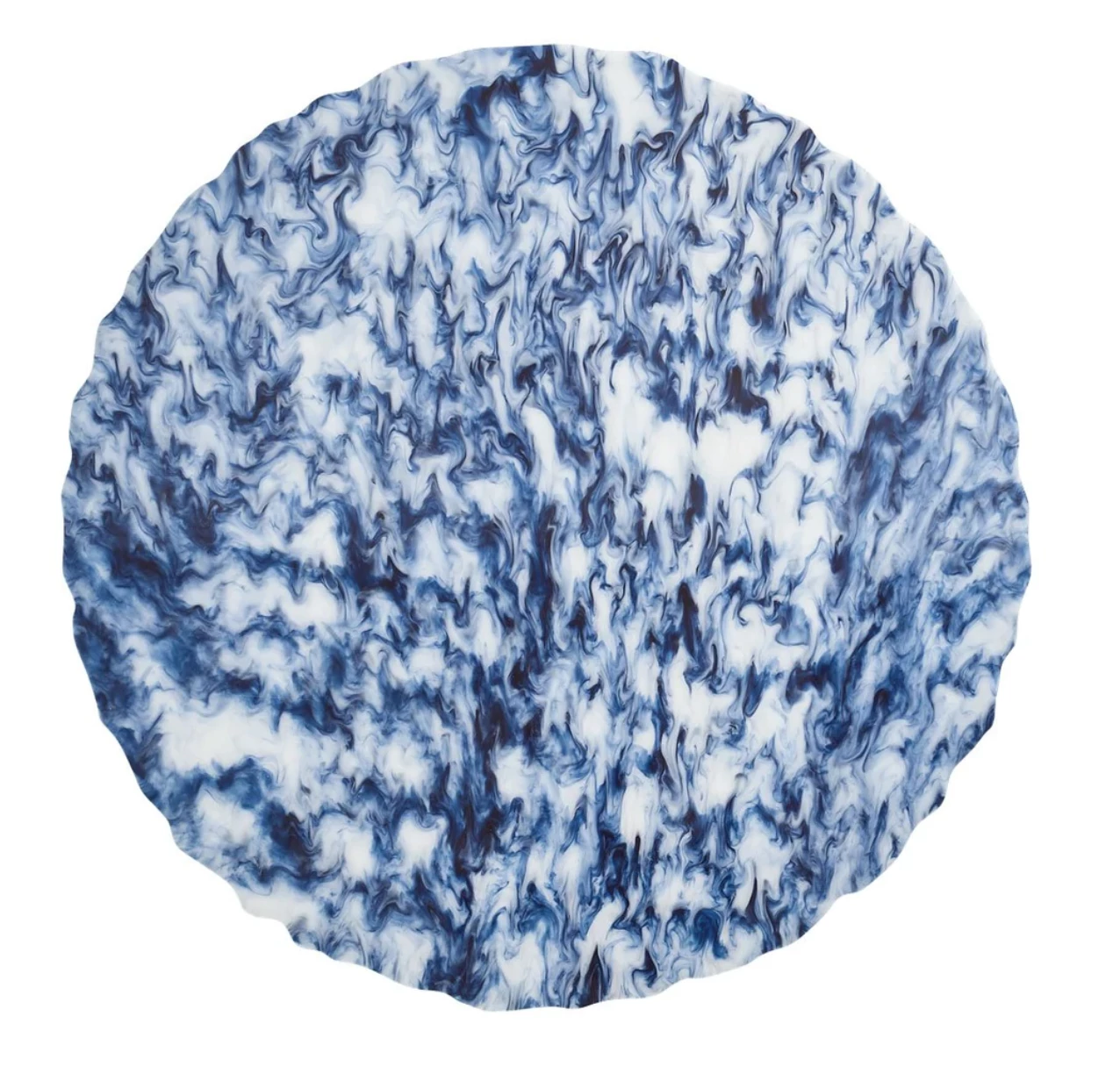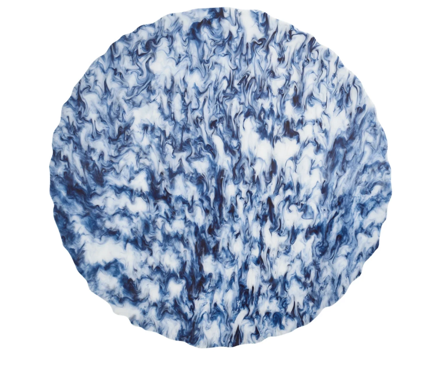 The round Waves Placemat by Kim Seybert is an abstract take on the rhythmic movement of the ocean. The Placemat features white and blue turns and swirls formed by hand-poured resin. Edges of the round acrylic placemat have curvy cuts mimicking the crest of a wave.