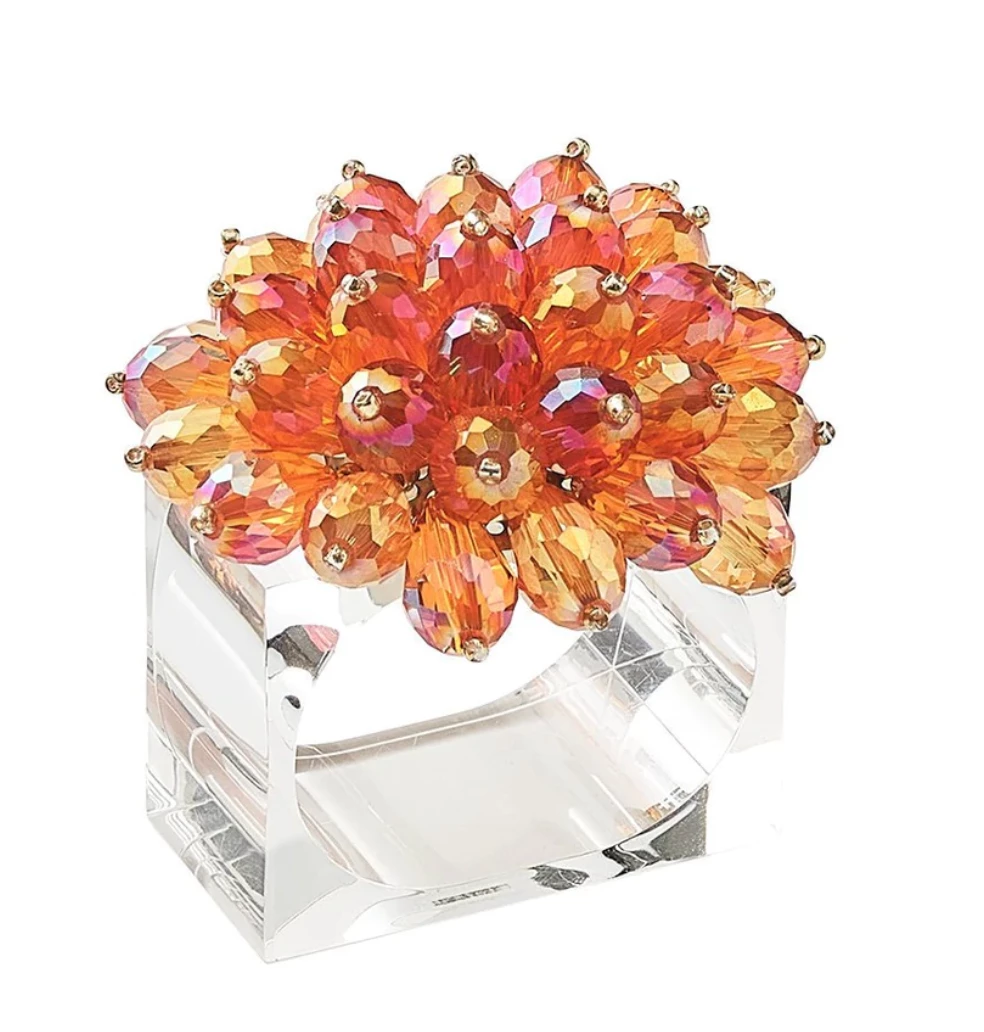 The beaded Zinnia Napkin Ring features shimmering pink and orange colored beads subtly mimicking elegant flower petals. The delicate beaded napkin ring sits atop a square clear acrylic base. This beaded napkin ring is perfect for a festive springtime table and elevates any elegant table setting. Sold in sets of four napkin rings.