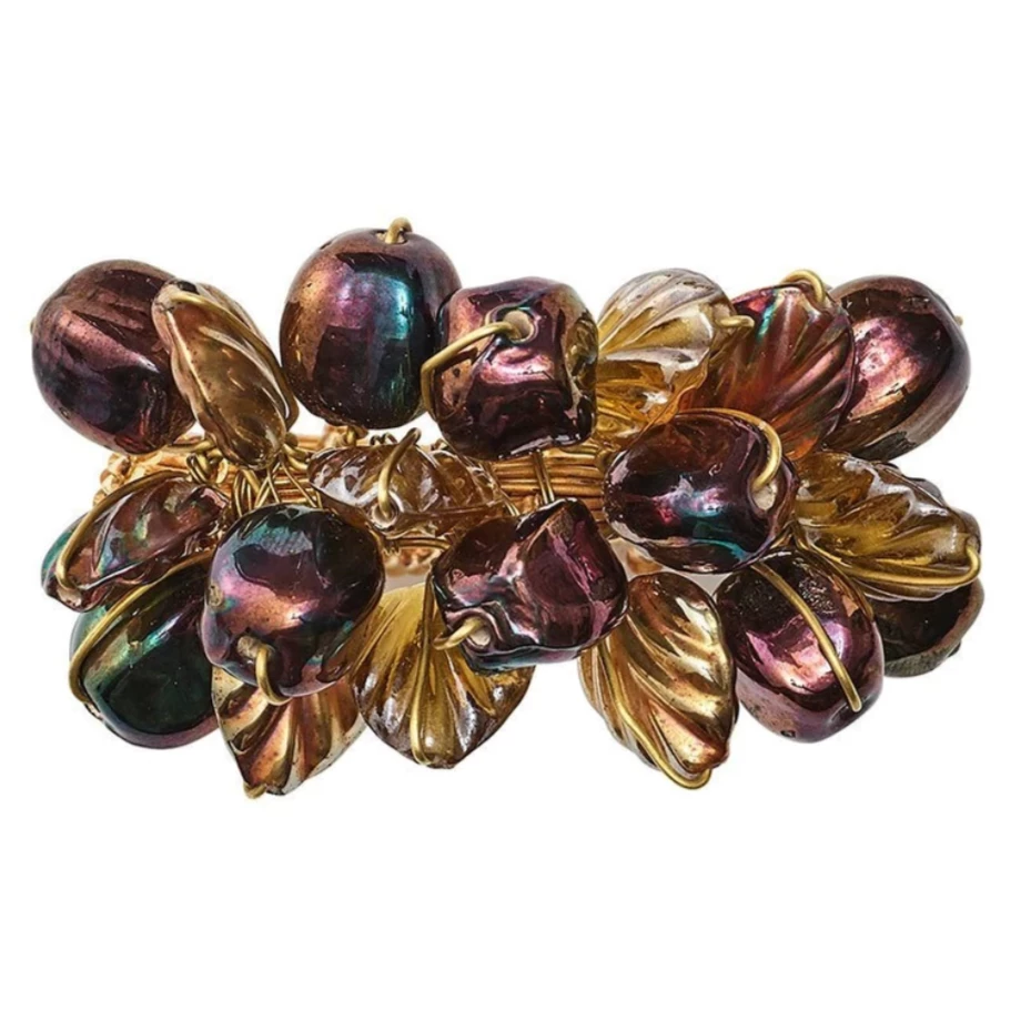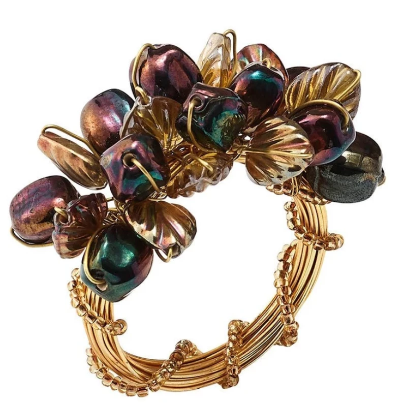 The gold Theodora Napkin Ring by Kim Seybert, is fashioned out of stunning iridescent glass beads and clustered together on a gold wire ring intertwined with gold beads.