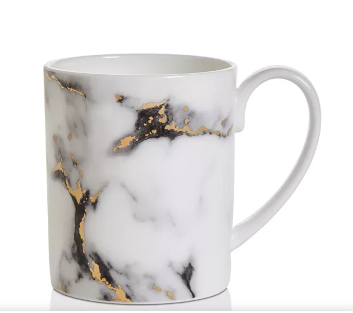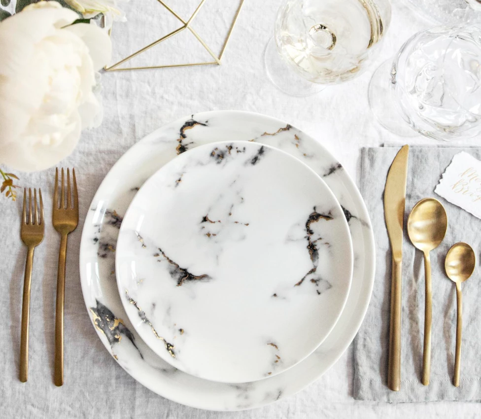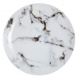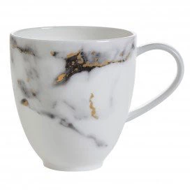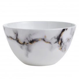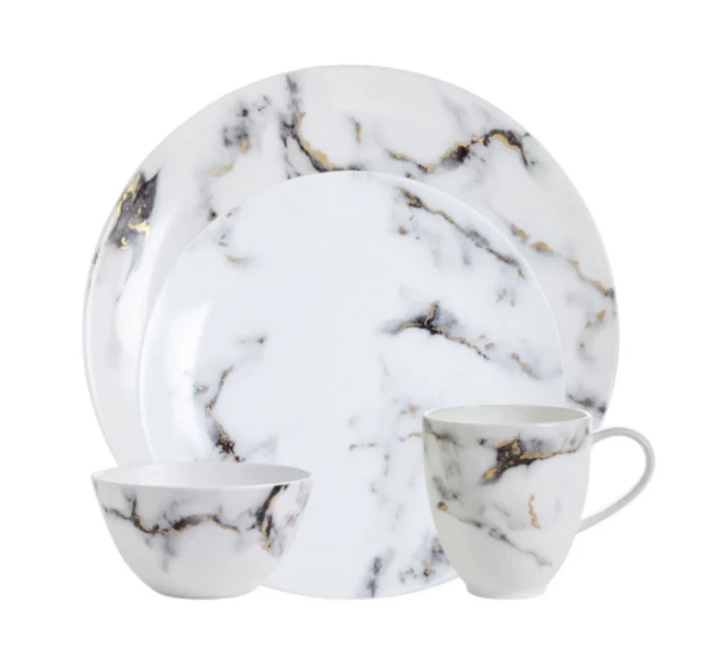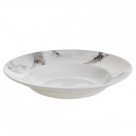 A modern design with a mottled grey marbelized look that is accented with 24k gold detailing throughout. The high quality bone china is durable and dishwasher safe using a non citrus detergent. Not able to be used in the microwave. Additional serving pieces are available. Call for details!