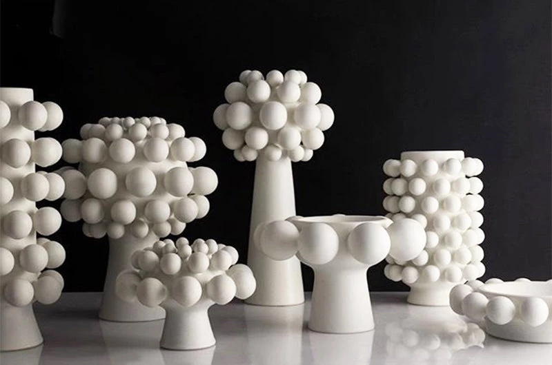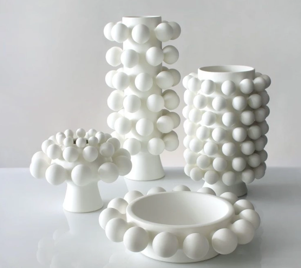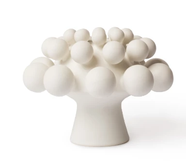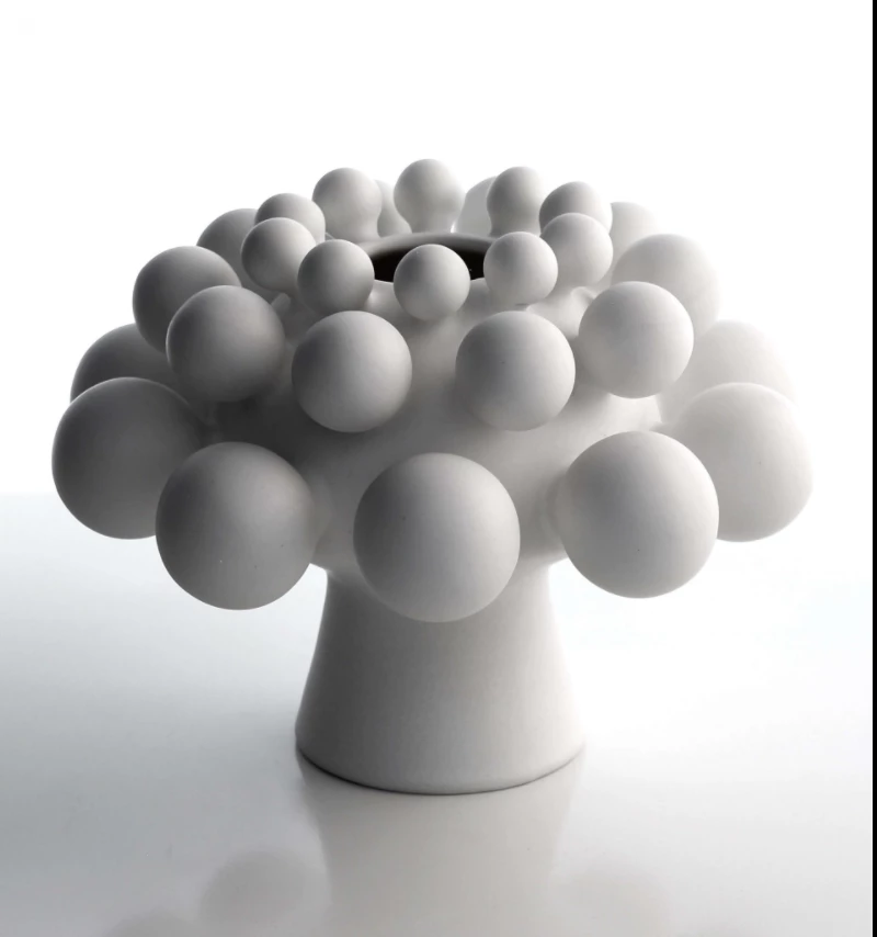 The Dome vase is part of the sculptural, hand made nimbus collection. The cloud-like, hand-appliqued, vessels are brimming with “blooms”. They make a bold statement on a bedside table or cocktail table.