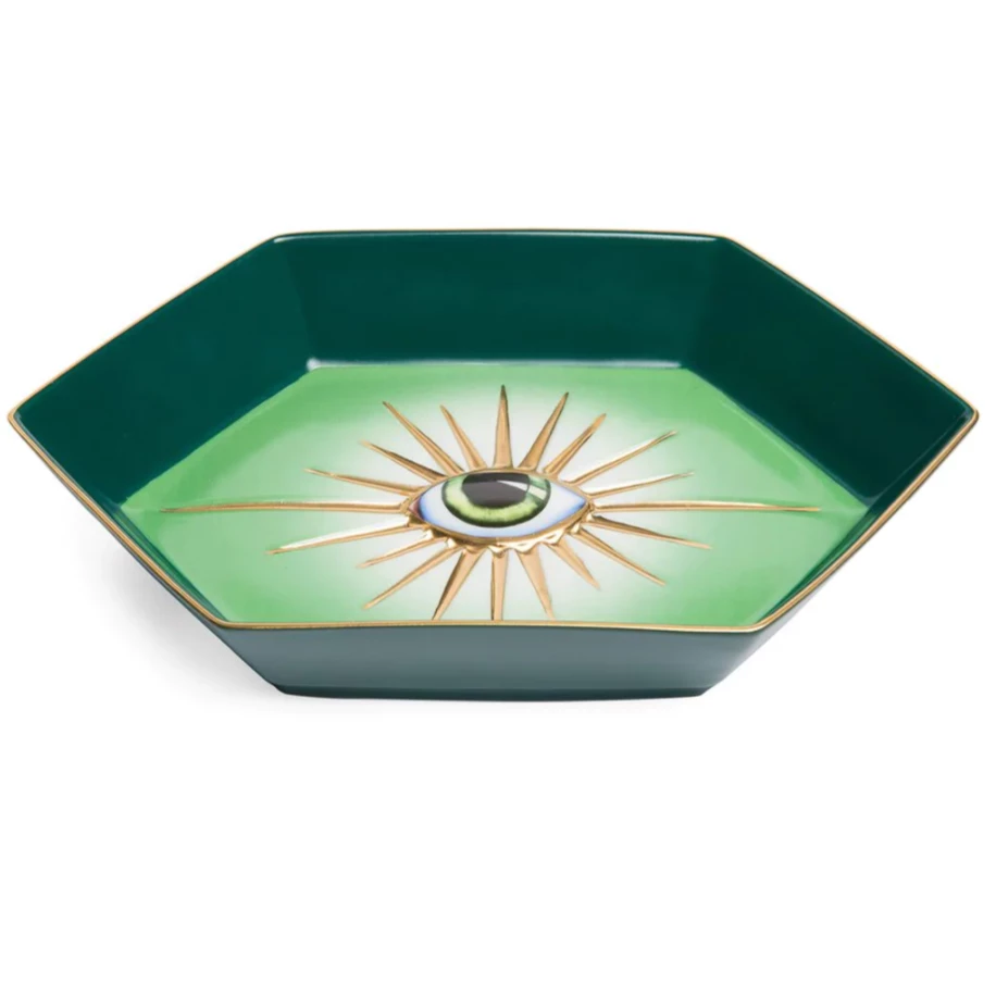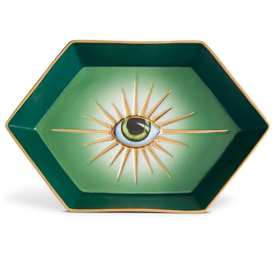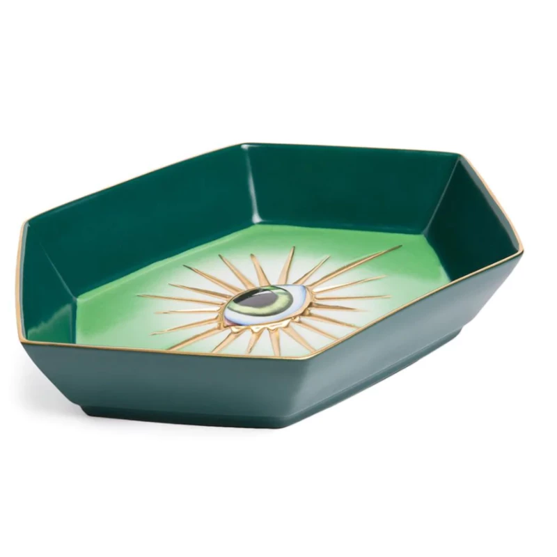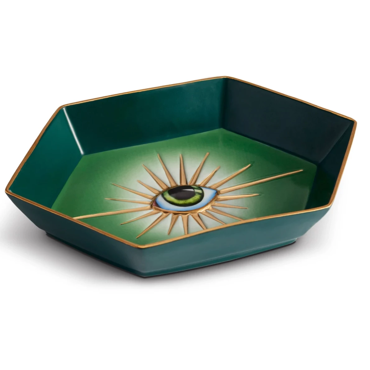 This tray by L’Objet features a surrealistic “talisman” of good luck and a traditional symbol of protection. Whimsical and surreal, this catchall is handcrafted from porcelain with 24-karat gold plating.
