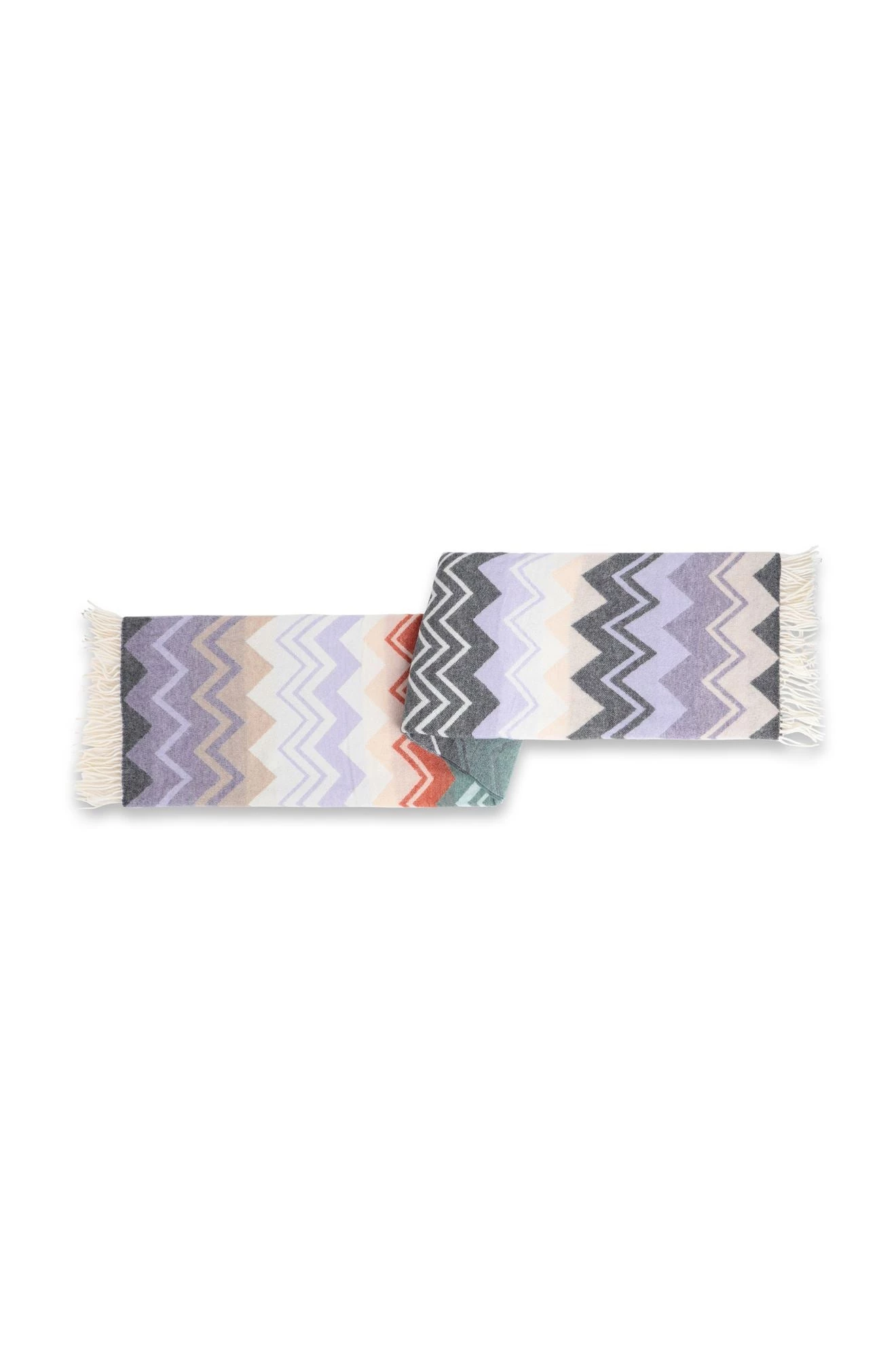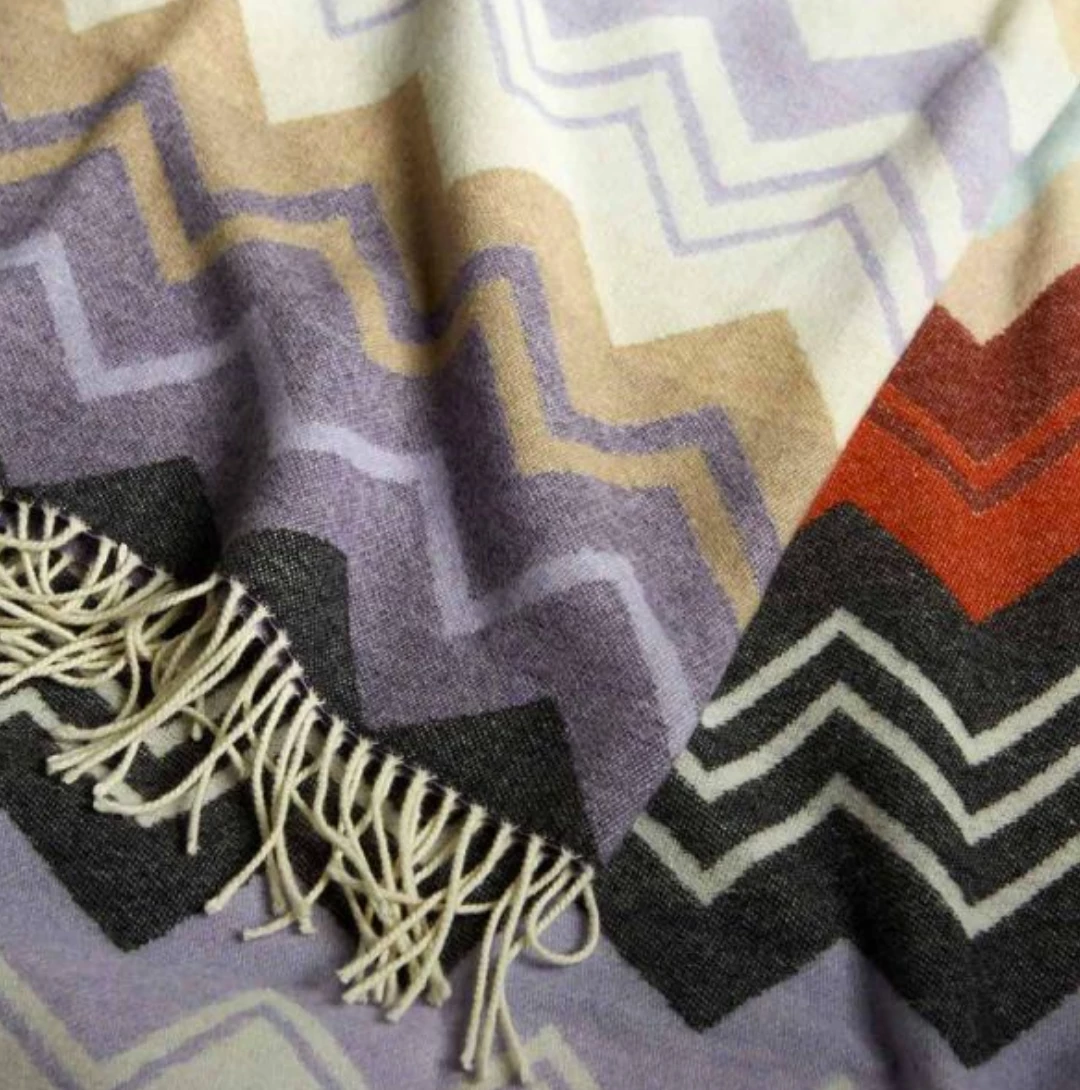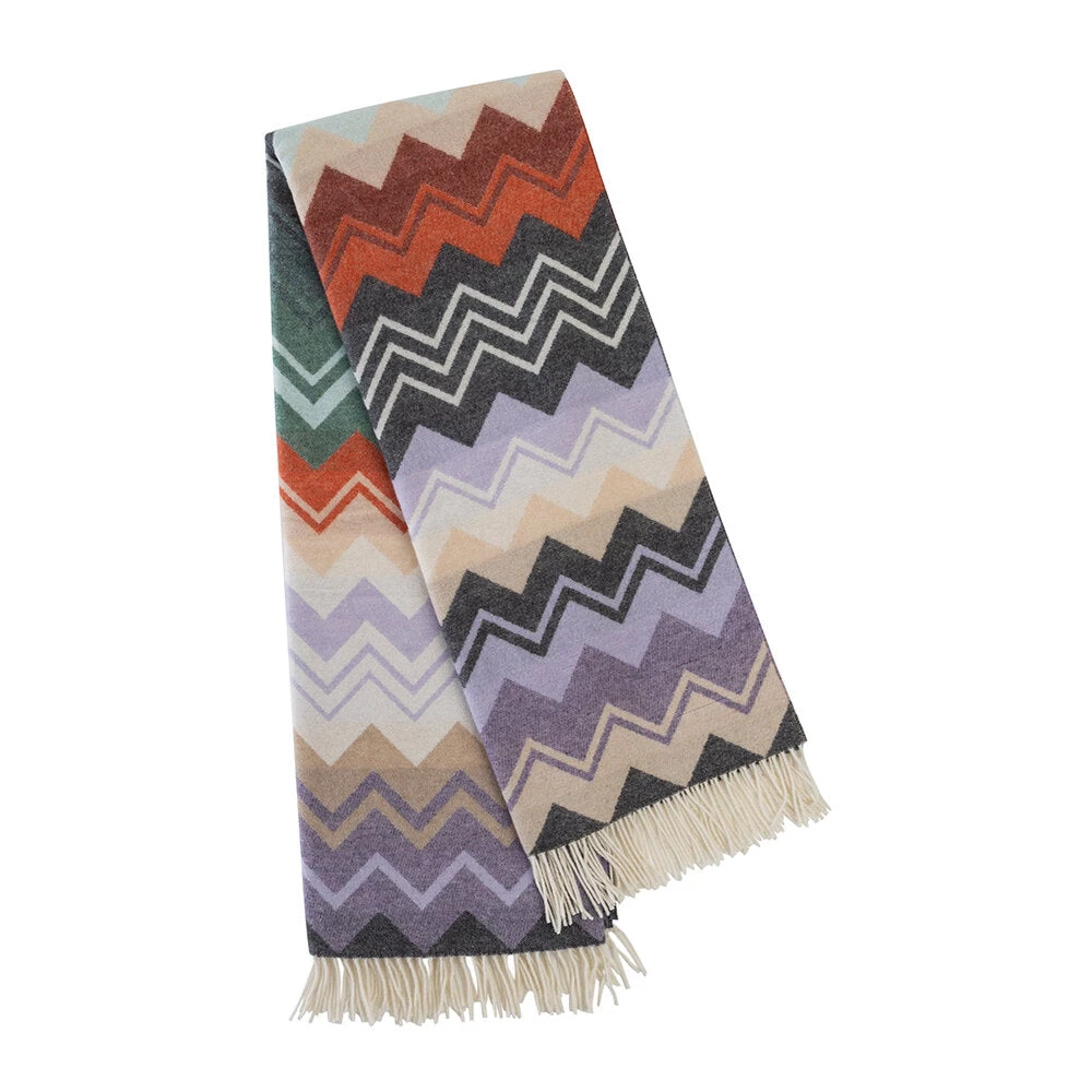This soft wool Missoni throw has the multi-colored Missoni signature zigzag jacquard design, in soft muted colors of greys, beige and mauve.