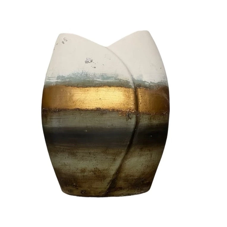 This hand painted vases shape was inspired by a tulip and the beautiful folded design make it extra special. The colors are highlighted by a golden stripe.