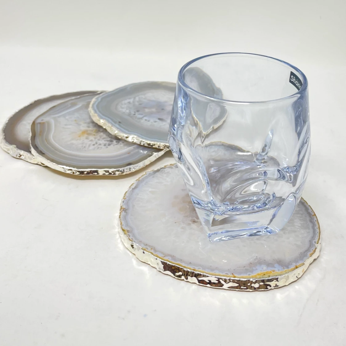 A Current Home Favorite! Bring one of a kind beauty to your coffee table or desk with these glamorous agate coasters with a pretty silver trim detail.