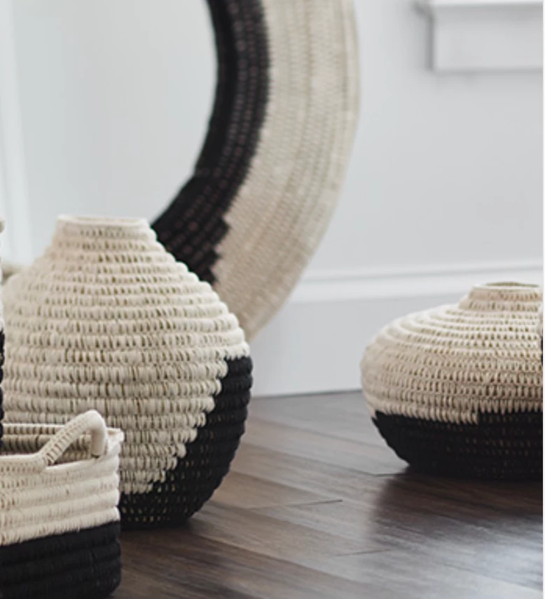 These dramatic urns feature hand-wrapped white and black cotton over a natural seagrass frame. They have a relaxed look that with beautiful craftsmanship.