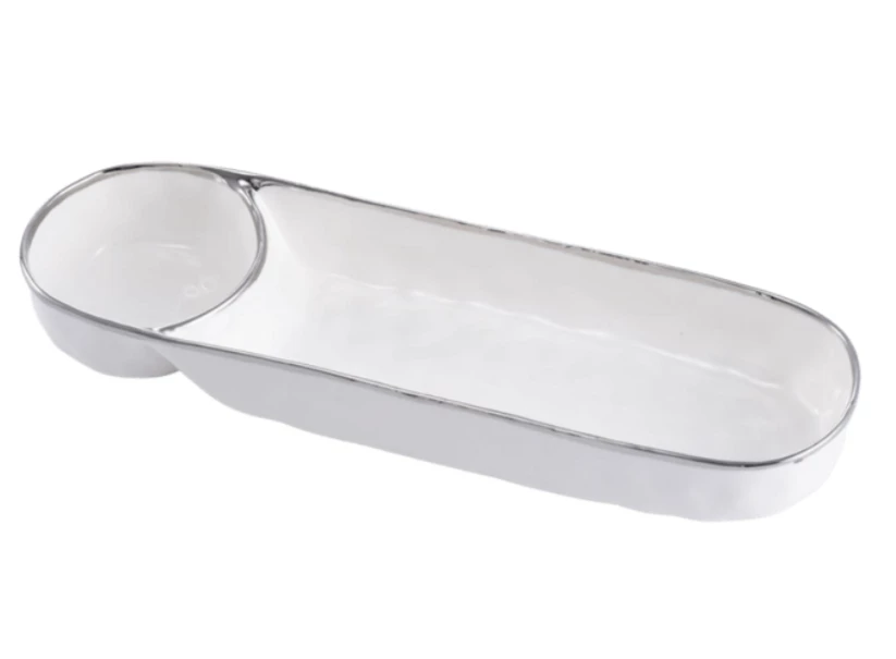 Perfect for any dip combo – hummus & pita, salsa & chips, veggies & ranch or our favorite berries with whipped cream! Serve it up hot or cold, the Bianca Chip & Dip is a versatile and popular serving piece that can also be used as a serving piece for other favorites like crab cakes with tartar sauce. Made of high fired porcelain, this chip and dip is oven safe up to 350 degrees. A perfect gift or piece to add to one’s own collection.