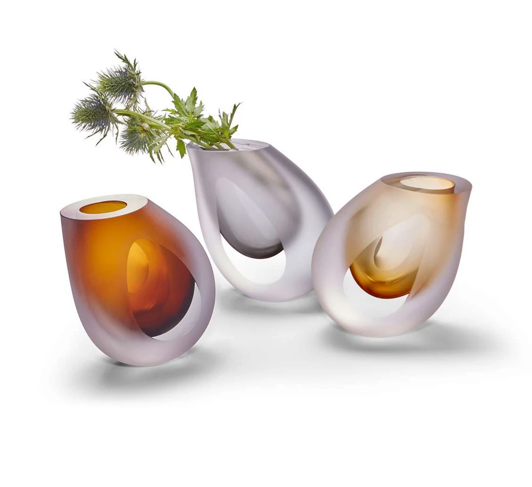 These hand-crafted vase´s breathtakingly sensual design is based on a water droplet shape combined with colors of amber, smoke-grey, and brown.