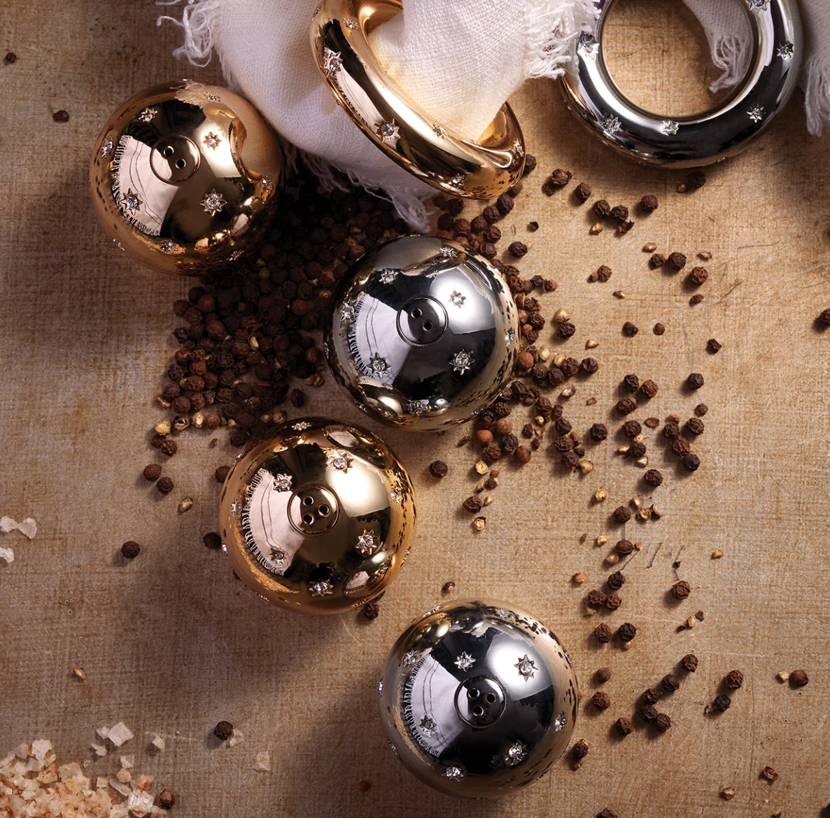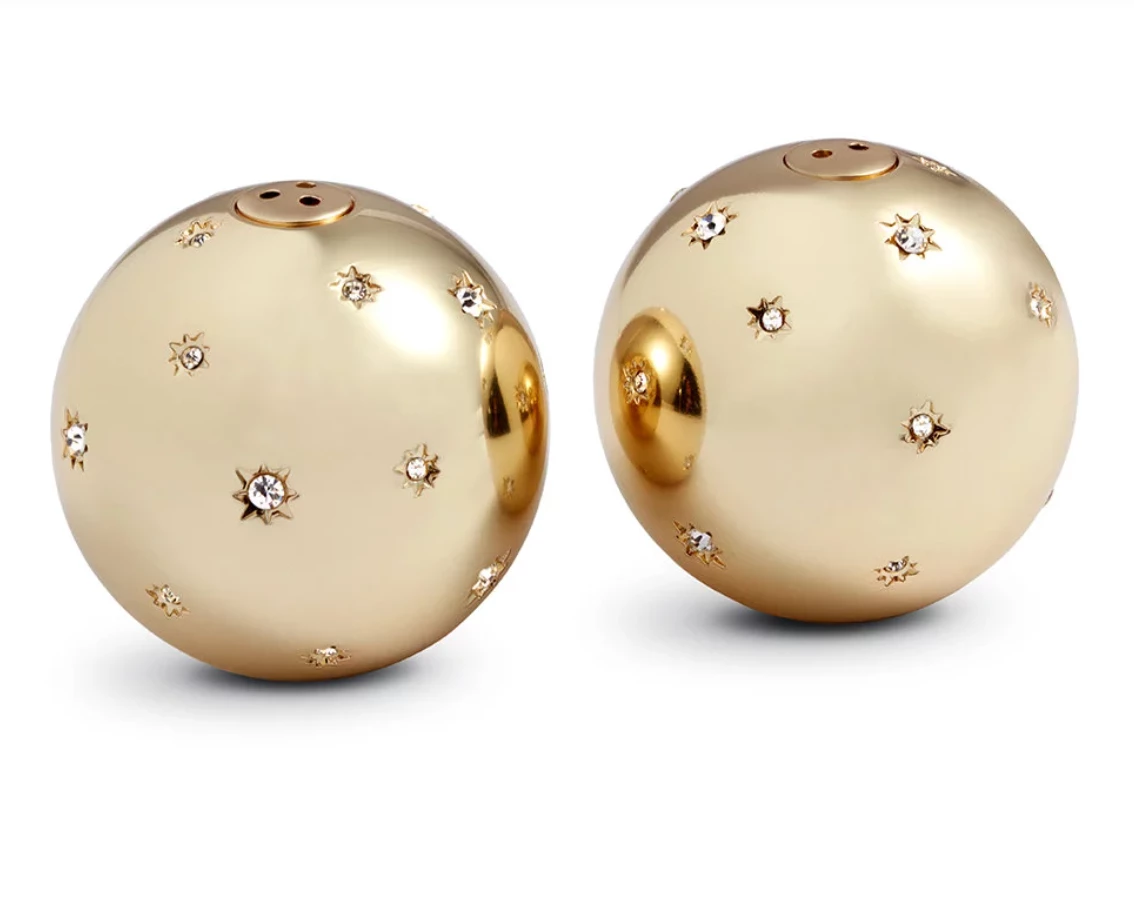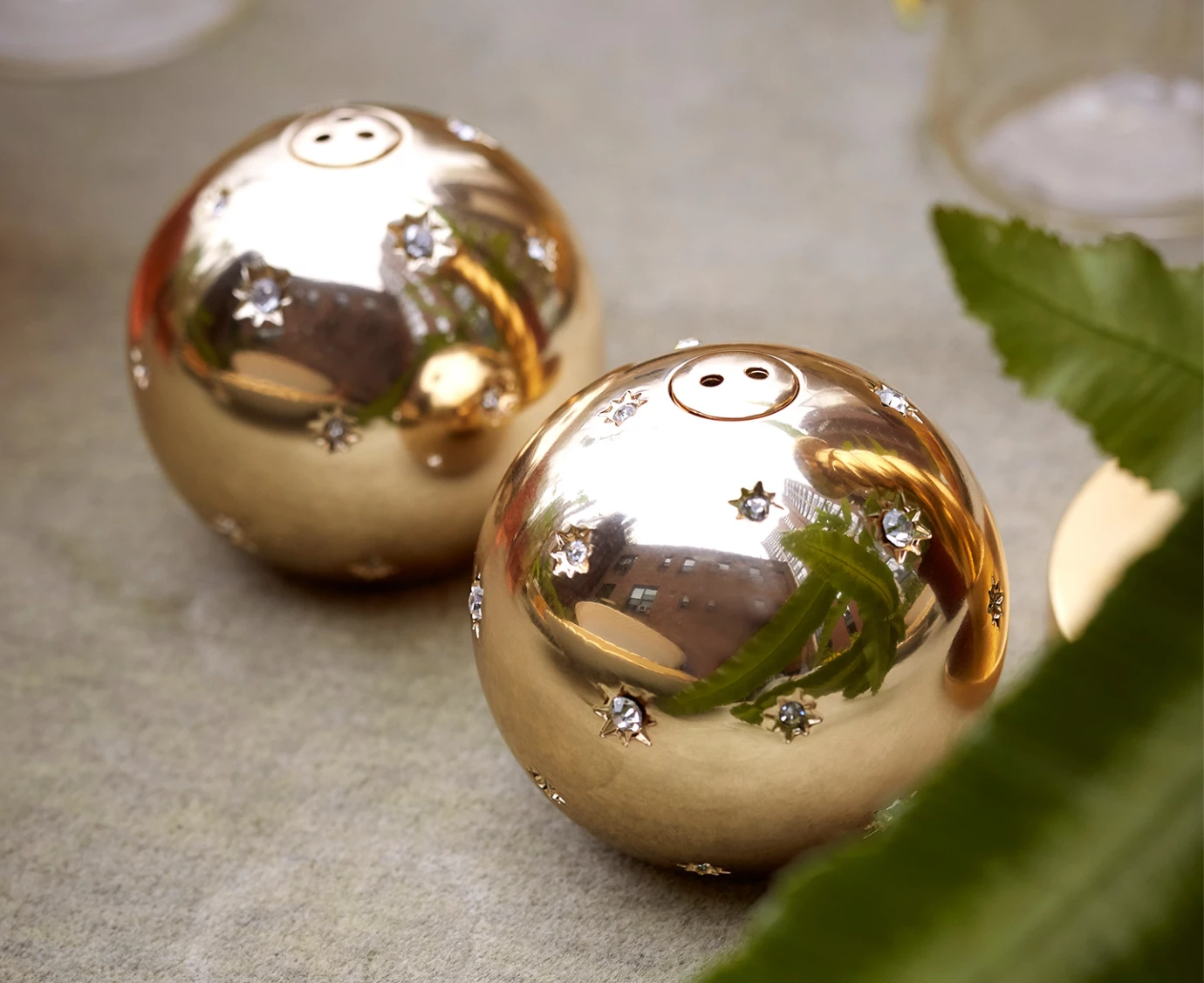 Illuminate your table with this shimmering Stars Spice Jewels Salt & Pepper Set. Masterfully crafted by hand, the spherical set incorporates 24k-gold with Swarovski crystals to create salt and pepper shakers of distinction.