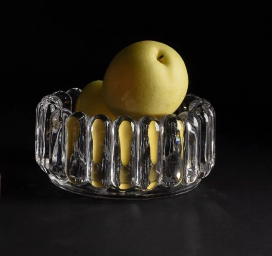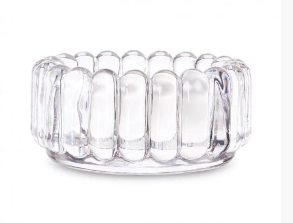 The Press bowl,by Tom Dixon, designed and engineered to catch and refract light, and to last forever. This heavyweight grooved bowl is made of fat, chunky coils of pure and clear transparent glass. Bold in silhouette and simple in function, it is manufactured by dropping big globs of molten glass at 1,200 degrees centigrade and pressed in two or three part iron moulds to create the immediately familiar silhouette.