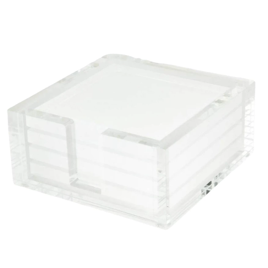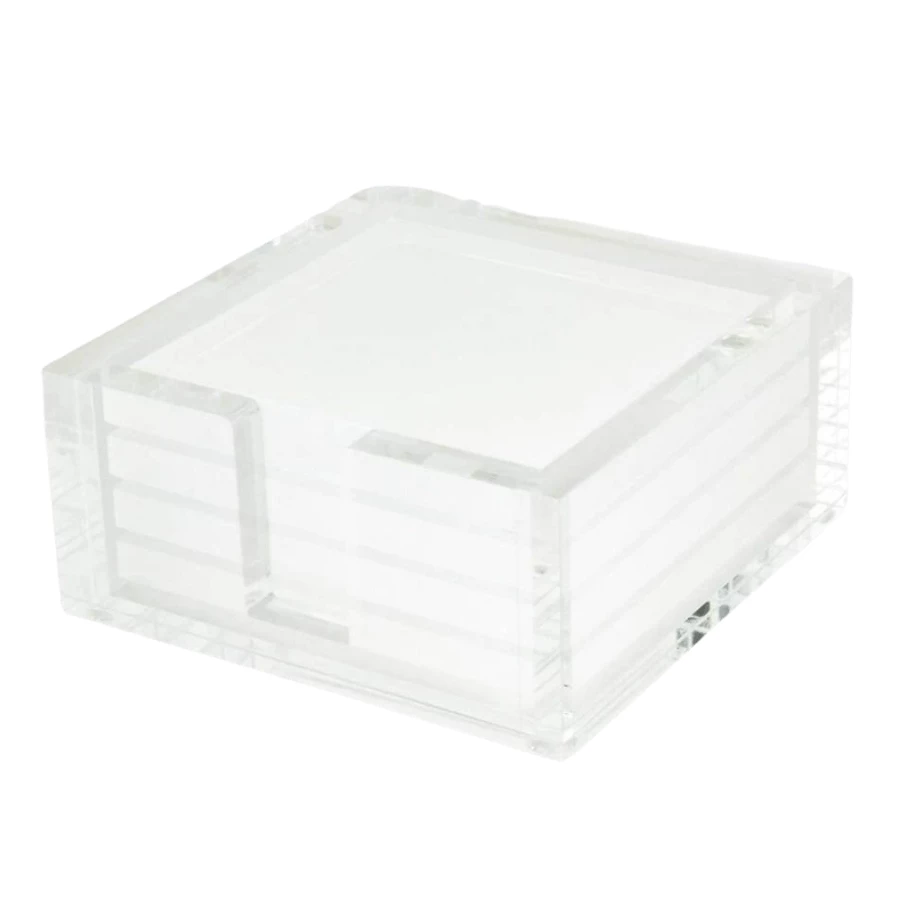 A simple and modern way to keep coasters available in a pinch. The Clear acrylic case sits nicely on your table and holds four generous size coasters that are just the right size for a drinking glass or wine glass.