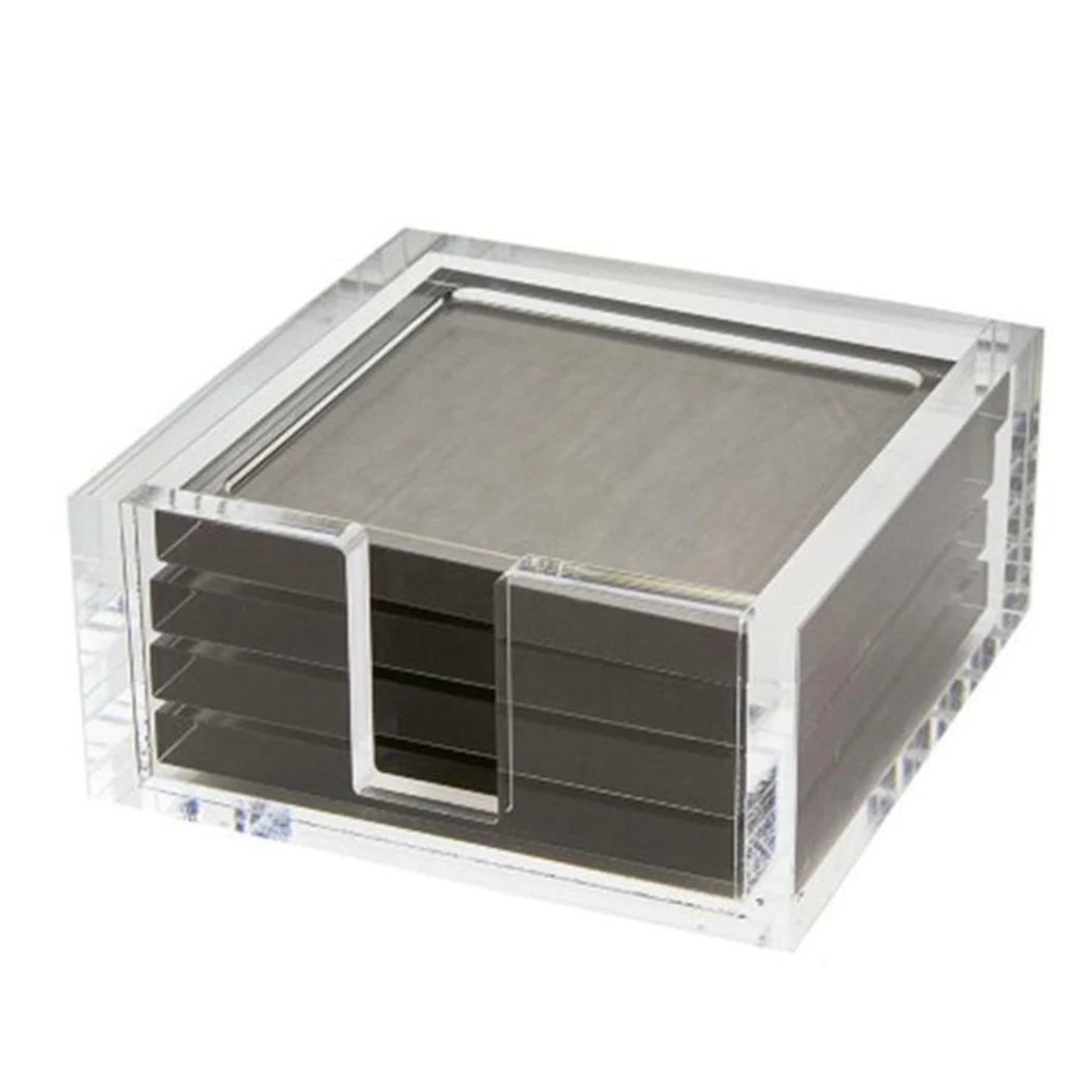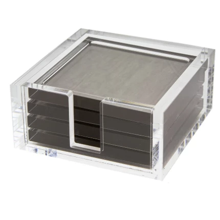 A simple and modern way to keep coasters available in a pinch. The Clear acrylic case sits nicely on your table and holds four generous size coasters that are just the right size for a drinking glass or wine glass.