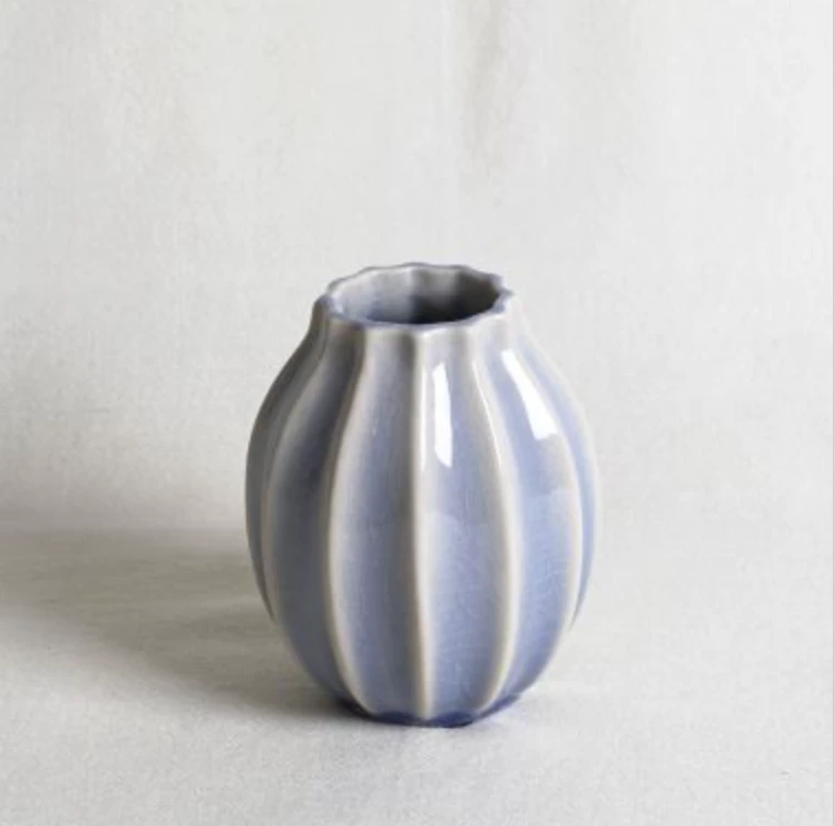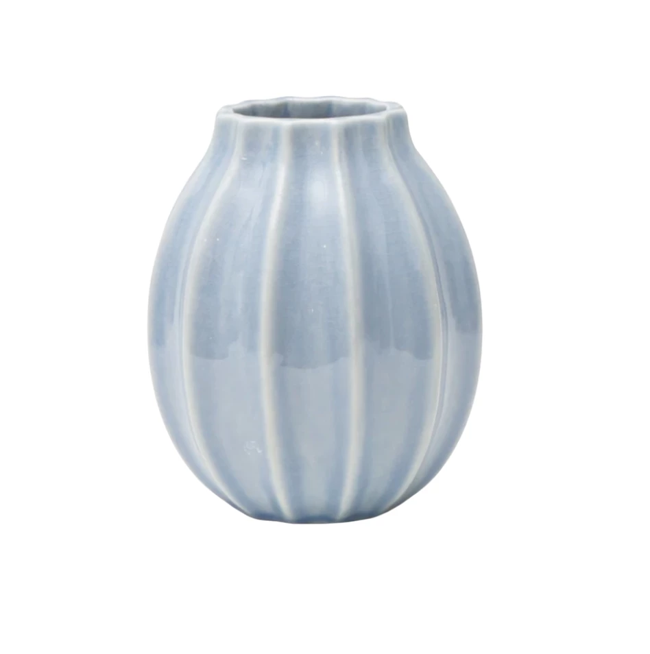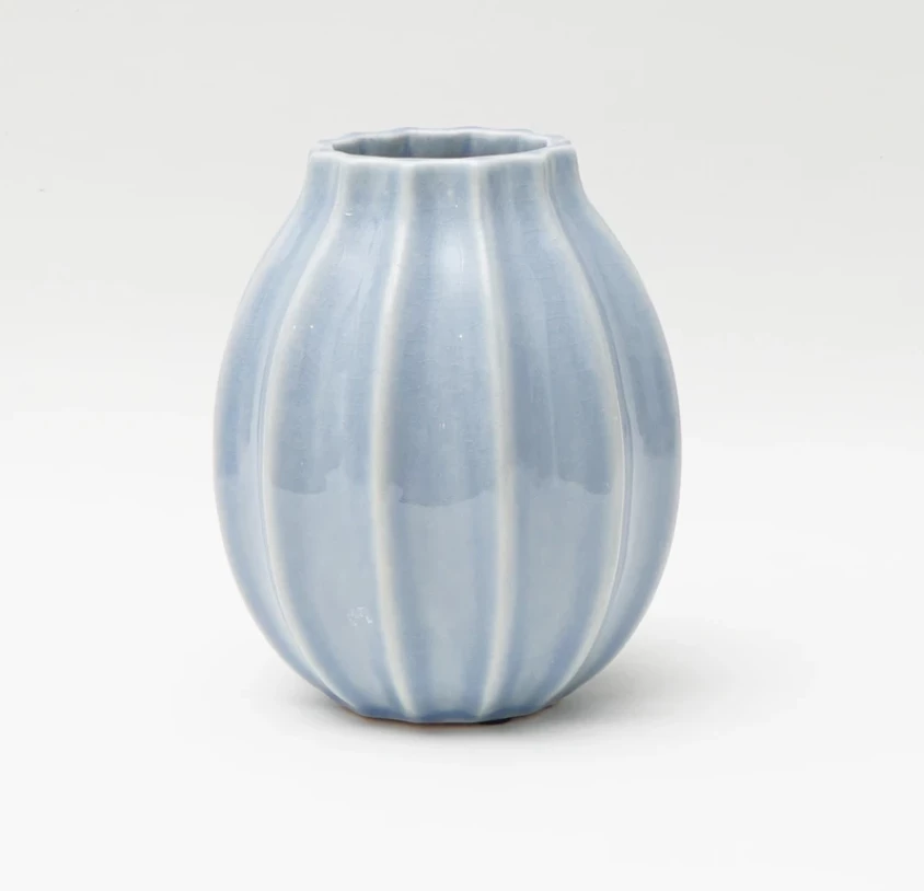 The small Tamara Vase has an Antique Blue glaze by Thomas O’Brien is the ideal piece for a desk or bedroom side table.