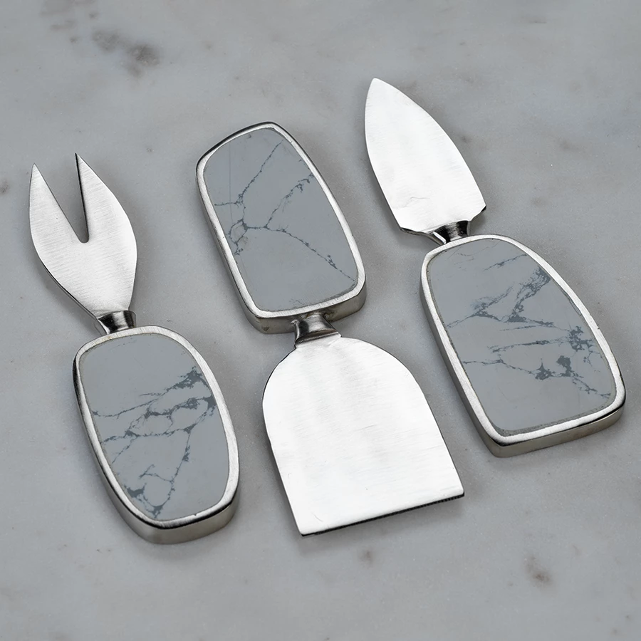 An attractive trio of cheese knives. The beautiful marble design handle has a silver edge and they complement many serving boards.