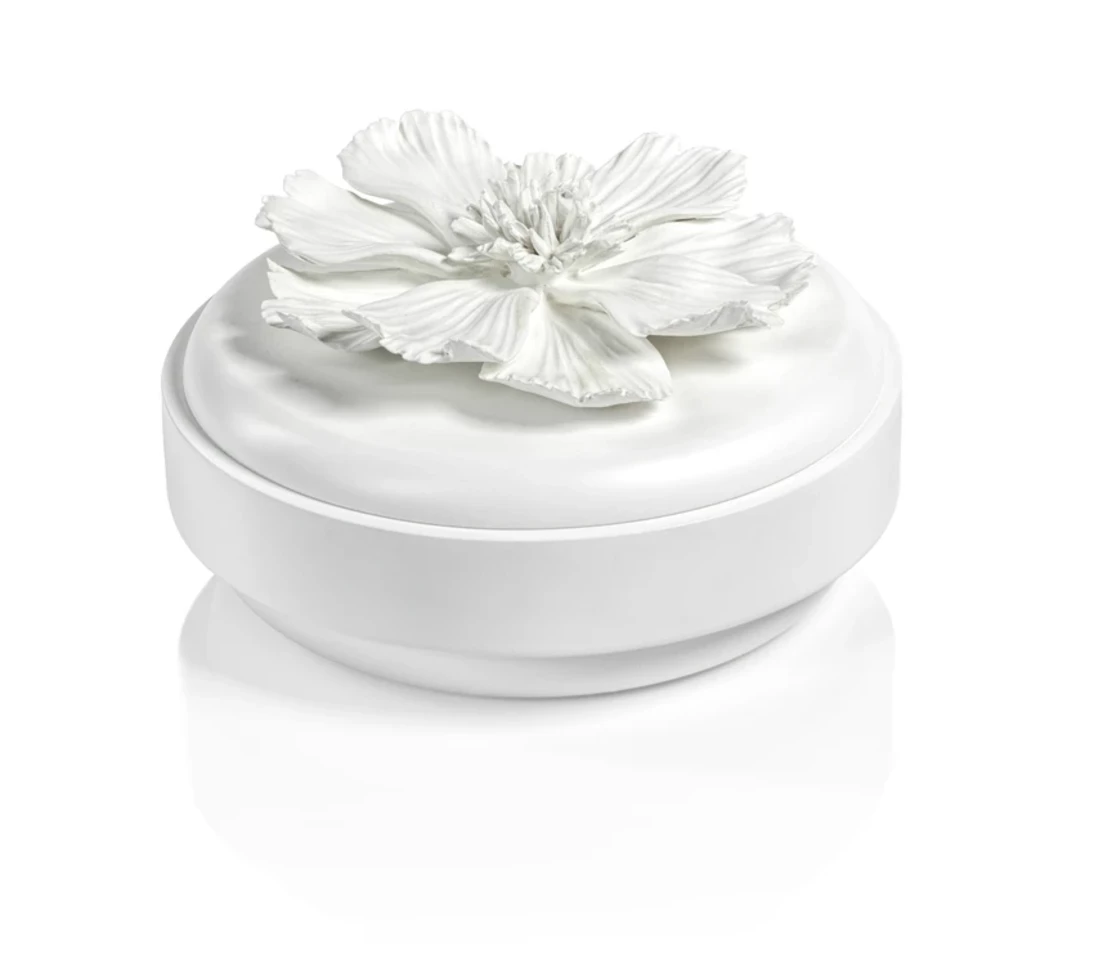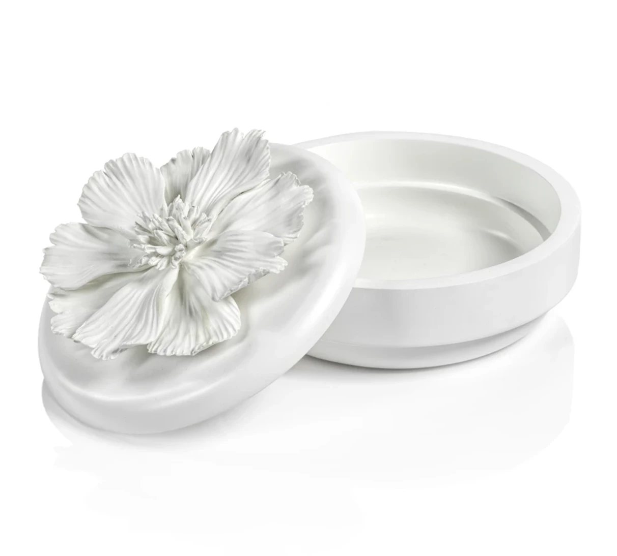 The Blossom Box has a sculptural flower adorning the top. Artfully crafted of wood and porcelain it makes a stunning piece of decor for a bedside table, cocktail table or desk.