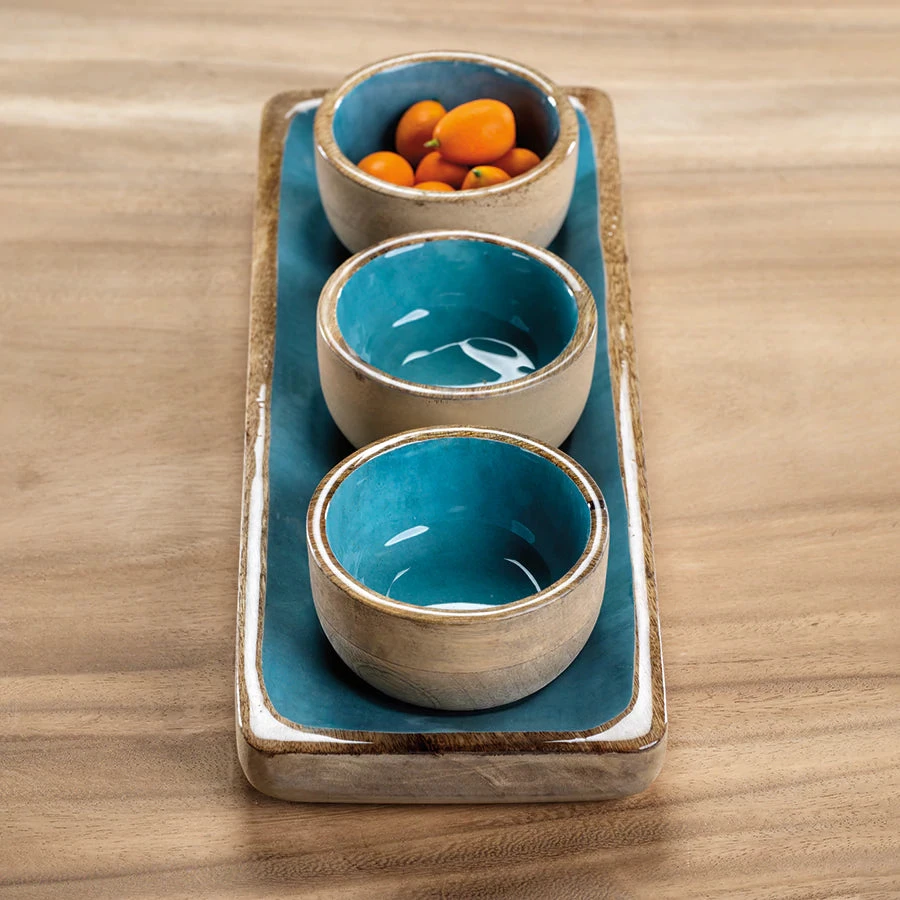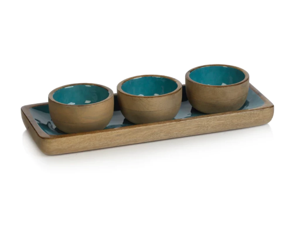 The Seychelles Condiment Set lets you serve at your next gathering in style. Set includes tray with three bowls. Perfect for mixing with all of the other great pieces in the Seychelles Mango Collection. (Sold Separately)