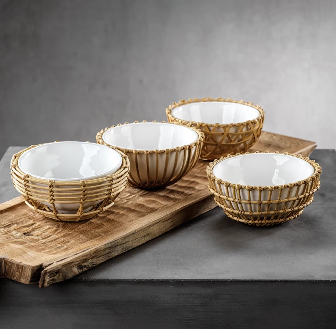 A mix of pretty wicker encases these charming ceramic bowls. Each bowl has a different design and they are wonderful for dips and sauces. We are unable to accept specific design requests.